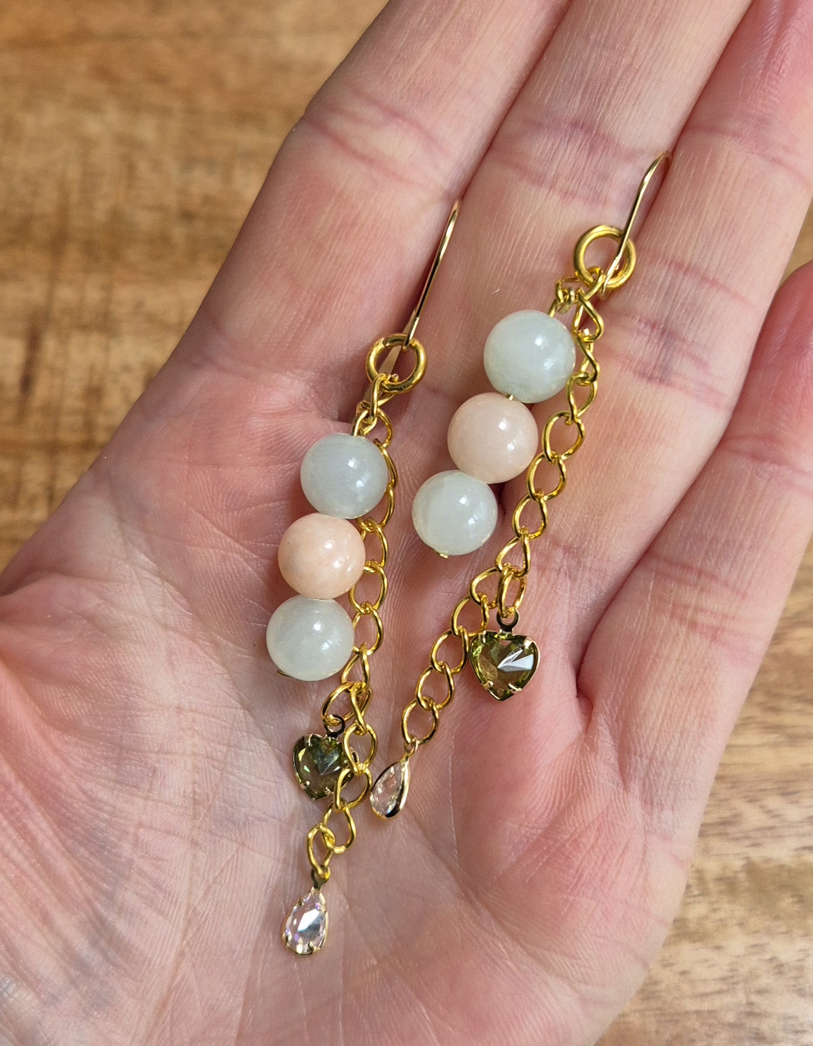 De goudkleurige oorbellen zijn voorzien van prachtige pastelkleurige kralen en RVS kettingen, met daaraan een schattig bedeltje in de vorm van een hart en een druppel. Met een lengte van 7,5 cm zijn deze oorbellen elegant en stijlvol, perfect voor elke gelegenheid. Voeg een vleugje kleur toe aan je outfit met deze unieke en trendy oorbellen.