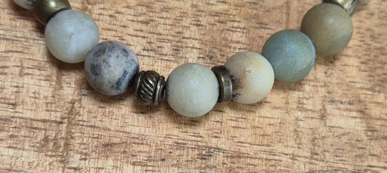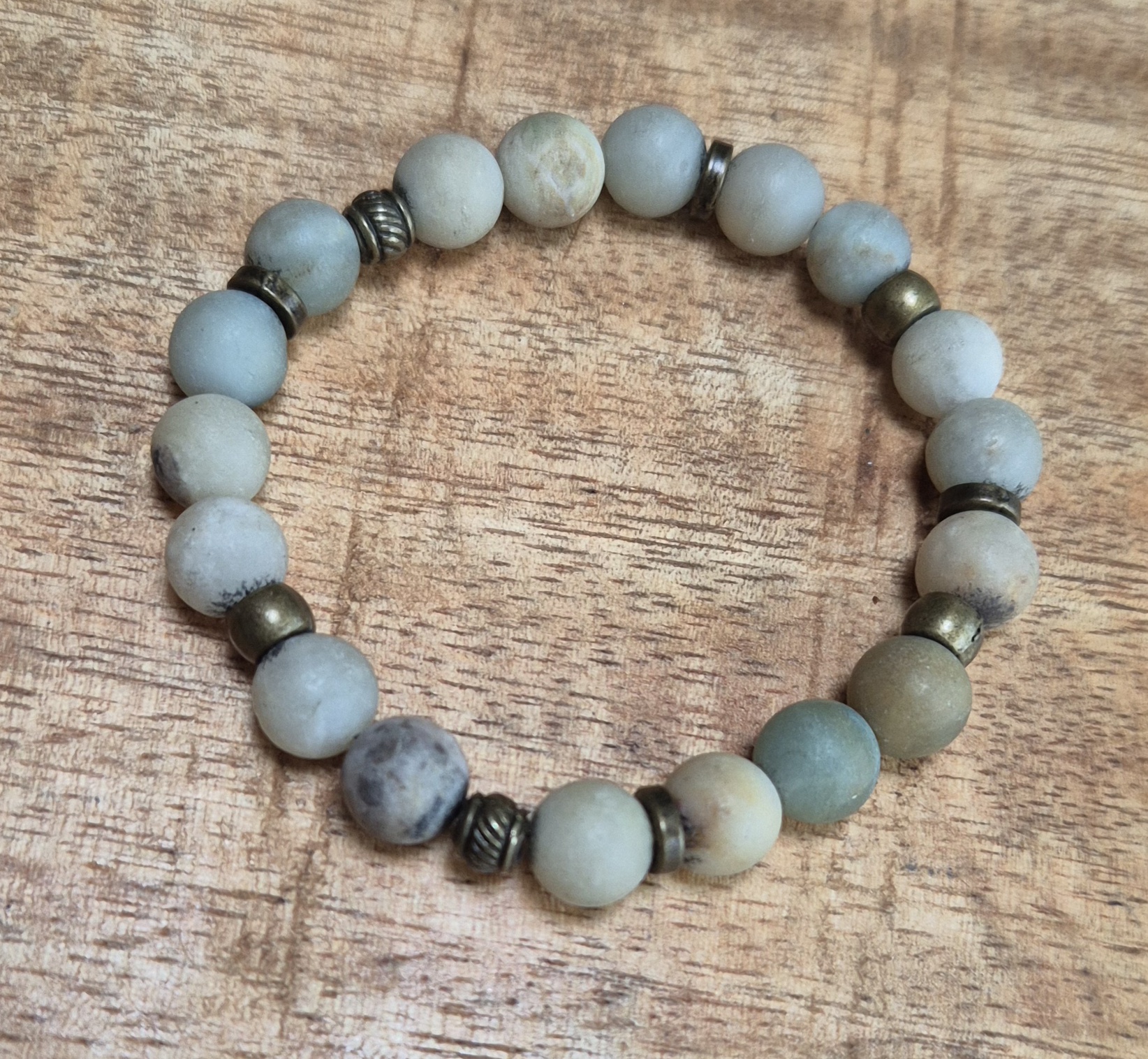 Deze armband is handgemaakt met 8mm Amazoniet kralen en koperkleurige tussenzetsels, wat zorgt voor een stijlvolle uitstraling. Door het elastische koord is de armband gemakkelijk om te doen en past deze perfect om een polsmaat van 17cm.