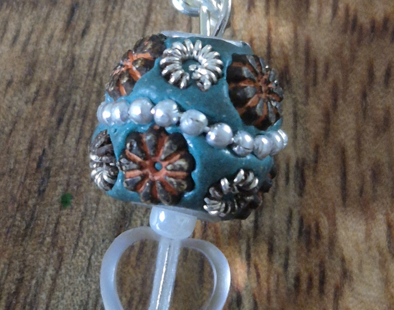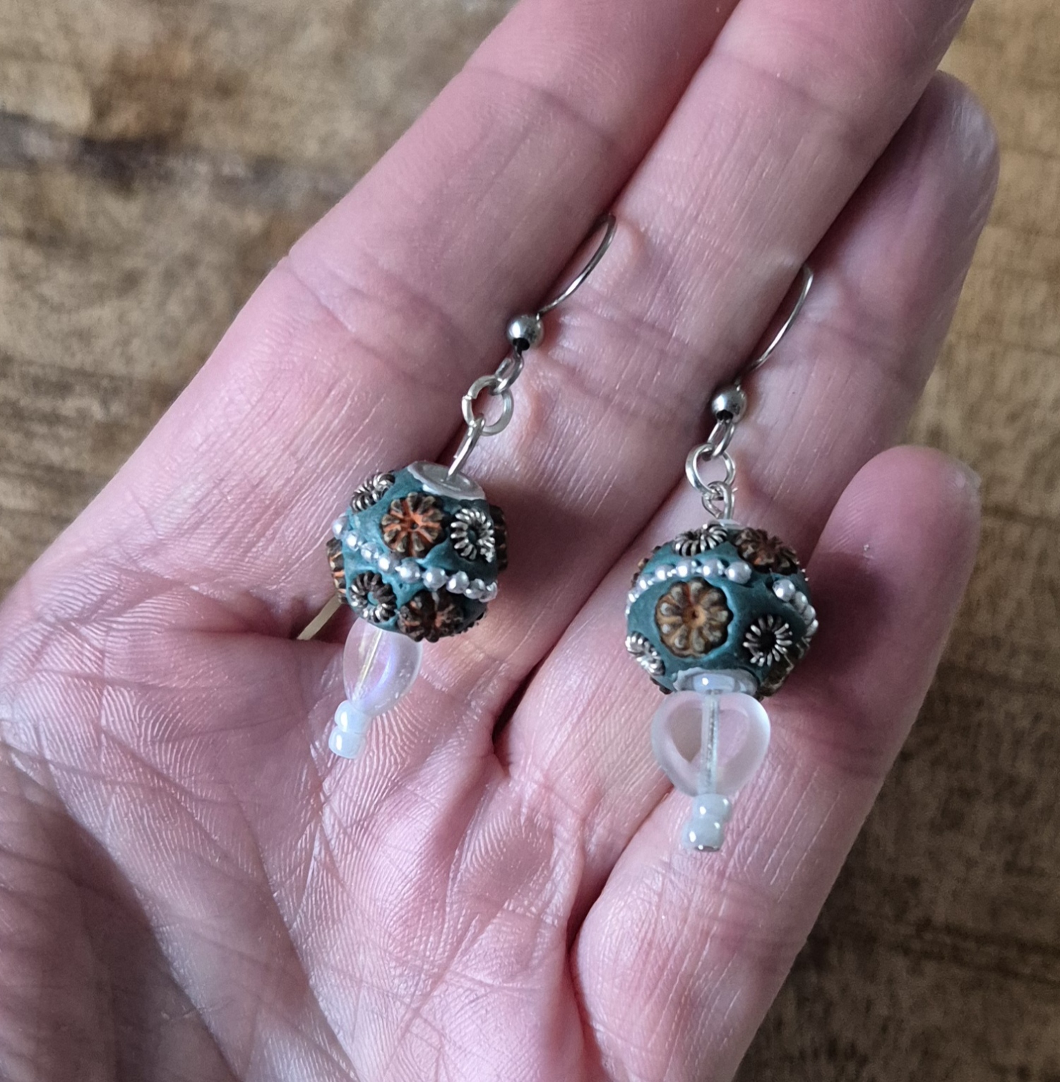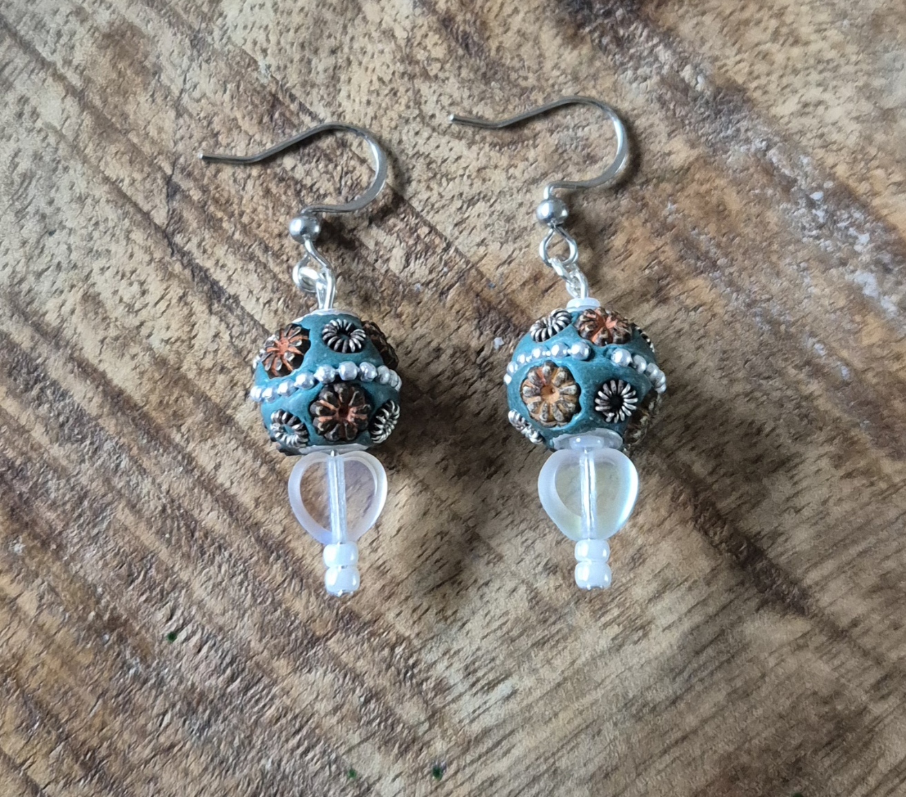 Deze handgemaakte oorbellen hebben een verfijnde, artistieke uitstraling. De turquoise kraal met subtiele bloemdetails vormt het hart van het ontwerp en geeft de oorbellen een unieke, bijna vintage charme. Daaronder hangt een transparante hartvormige hanger die zacht meebeweegt en het licht op een elegante manier vangt. De eenvoudige metalen oorhaakjes maken het geheel luchtig en stijlvol.