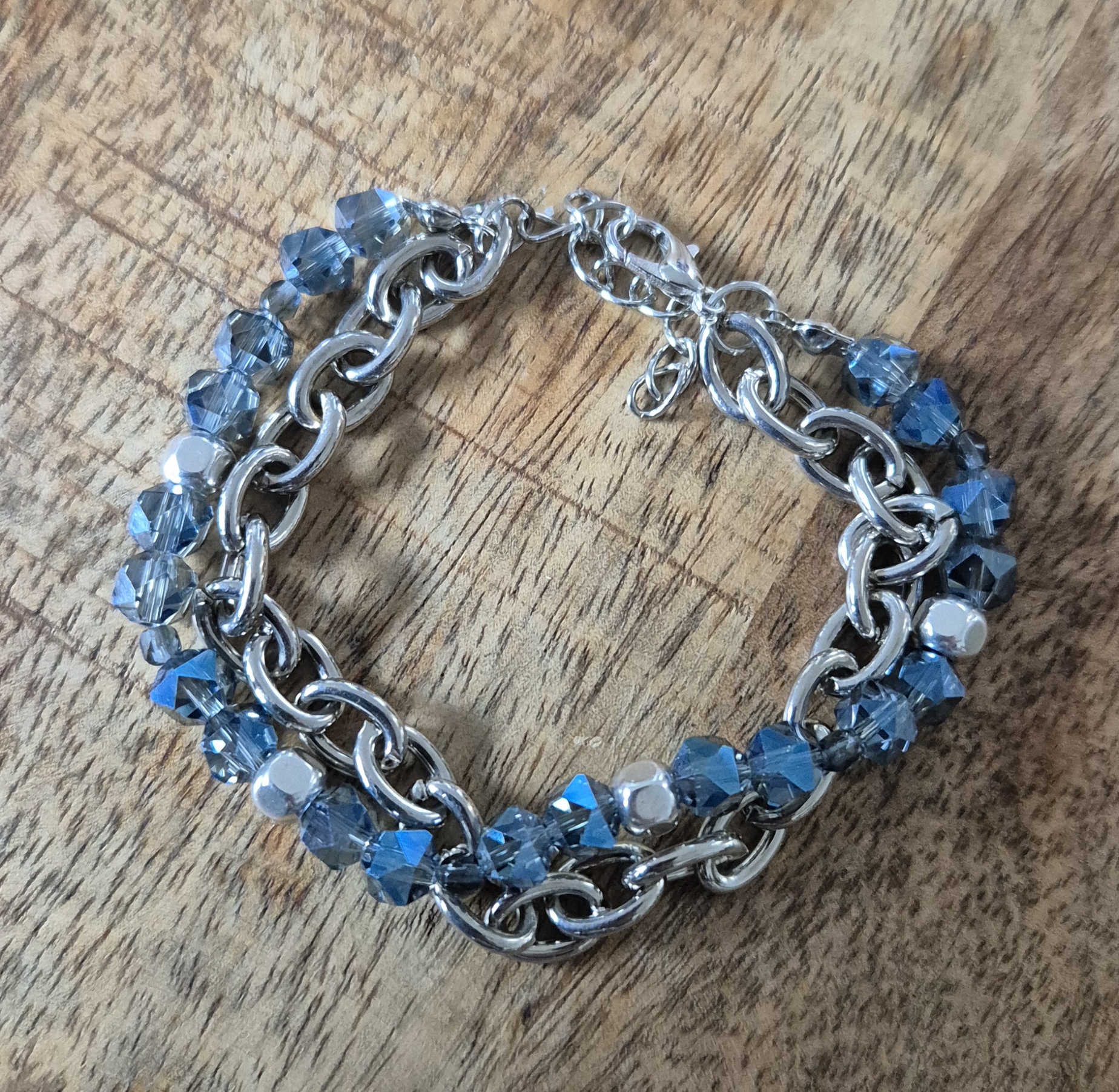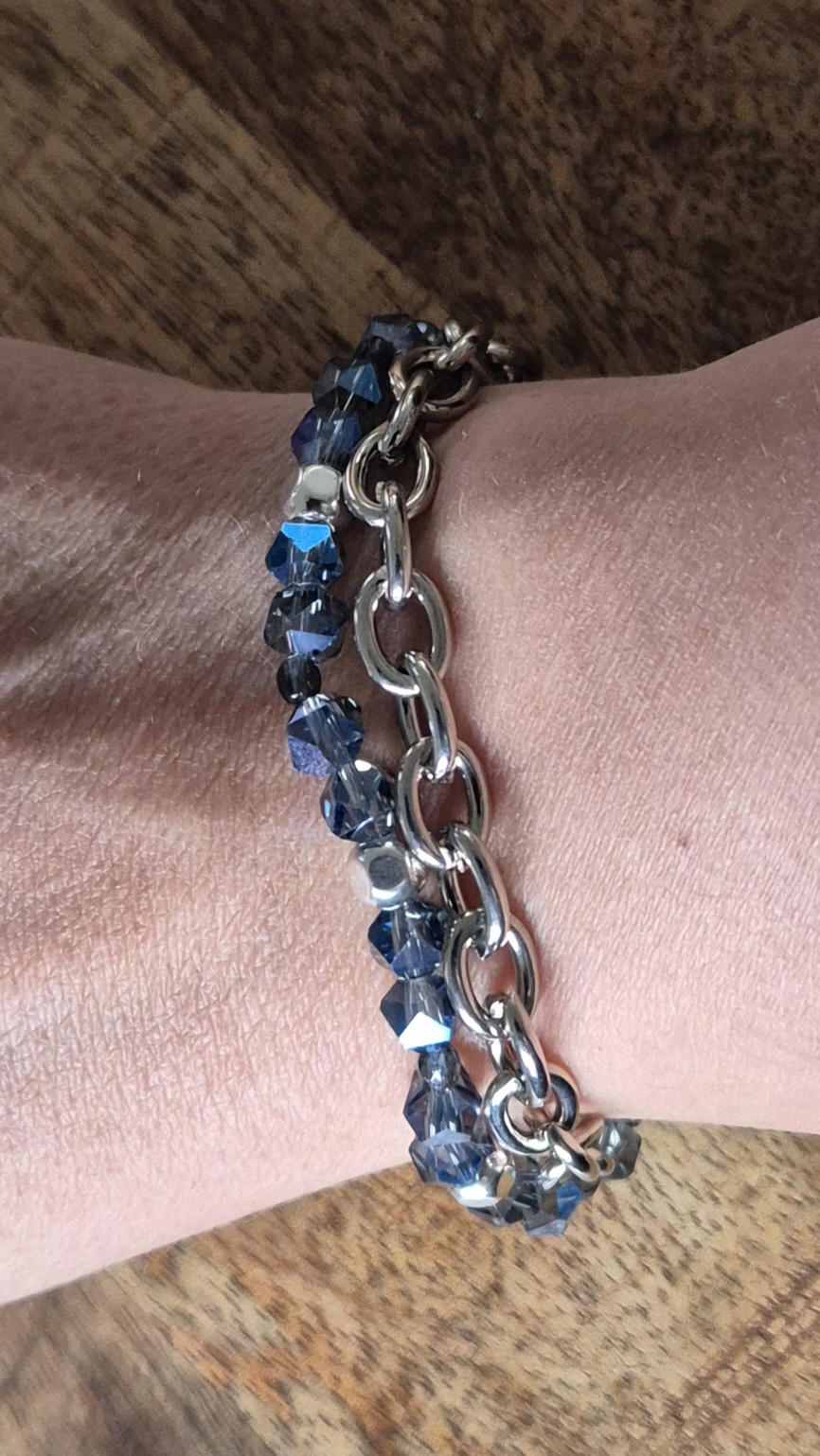 Stijlvol armbandje van blauwe glaskralen, gecombineerd met zilverkleurige metalen kralen en een verfijnde zilverkleurige ketting. De mix van materialen zorgt voor een frisse, elegante uitstraling die gemakkelijk te combineren is met andere sieraden.De armband is voorzien van een zilverkleurige sluiting met verlengketting, waardoor hij comfortabel te dragen is bij een polsmaat van 16,5 cm tot 20 cm. Perfect voor zowel dagelijks gebruik als een subtiele finishing touch bij een speciale outfit
