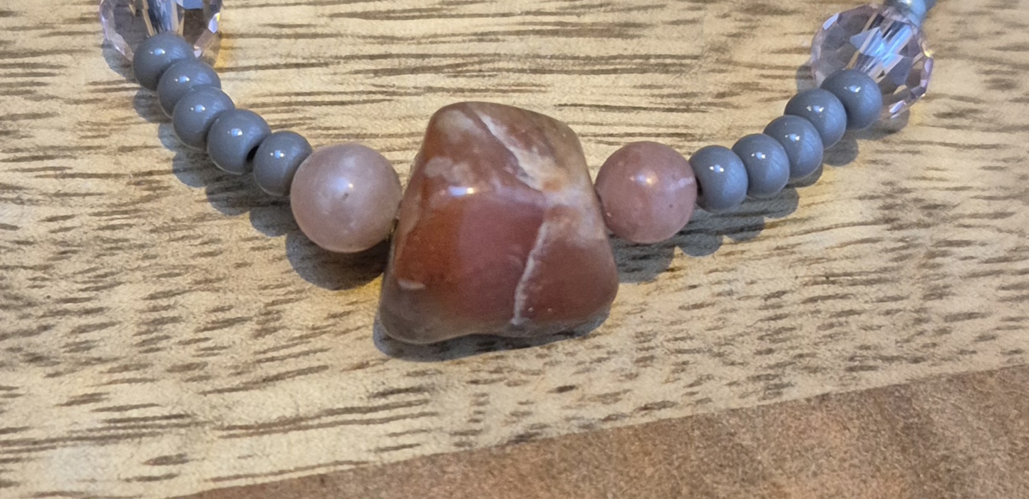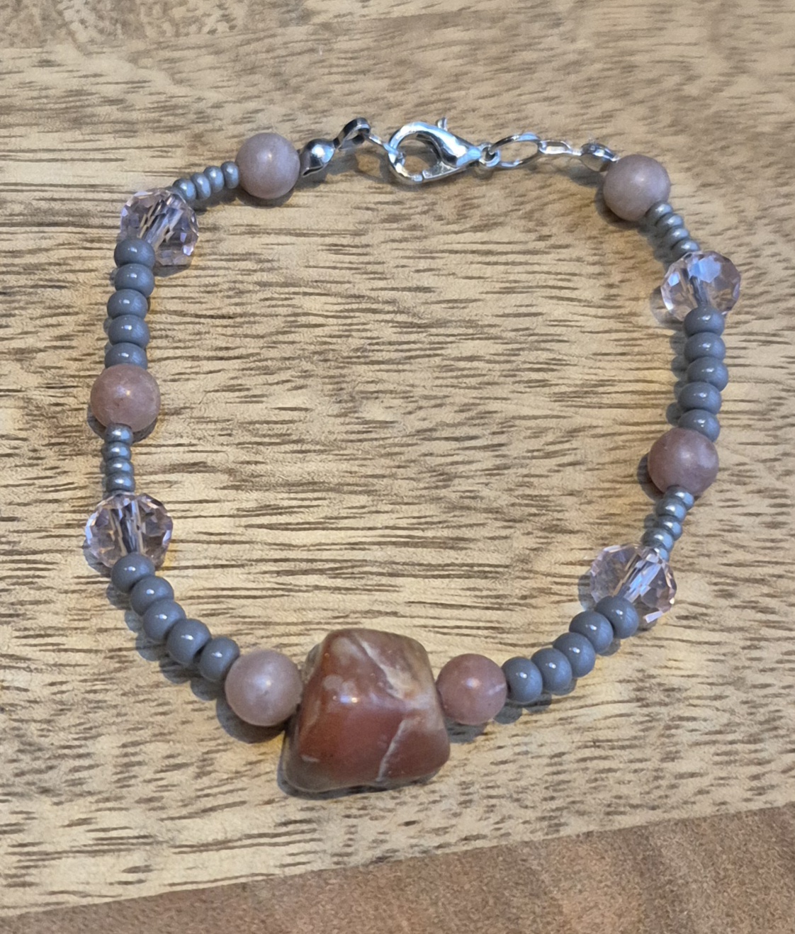 De armband is handgemaakt van rocailles, glaskralen en een mooie grote steen die geregen zijn op stevig Nylon draad. Met een zilverkleurige sluiting is deze armband perfect voor een polsmaat van 18cm. De kleurencombinatie van grijs, oranje en roze zorgt voor een uniek en opvallend design dat zeker de aandacht zal trekken. Of je nu op zoek bent naar een cadeau voor een vriendin of gewoon jezelf wilt verwennen, deze armband is een prachtige toevoeging aan je sieradencollectie.