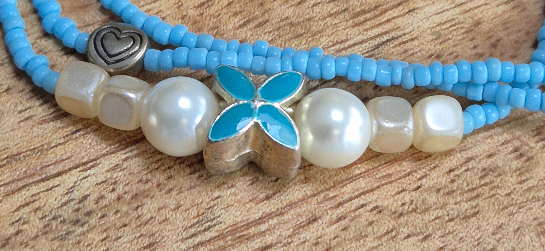 De armband is gemaakt van kleine lichtblauwe rocailles en is afgewerkt met metalen zilverkleurige kralen, een metalen blauwe bloem kraal en crème kleurige glazen kralen. De armband heeft een zilverkleurige sluiting met een verlengketting, waardoor hij perfect past bij een polsmaat van 19cm t/m 23cm. Met zijn unieke en kleurrijke design is deze armband een echte eyecatcher die elke outfit compleet zal maken.