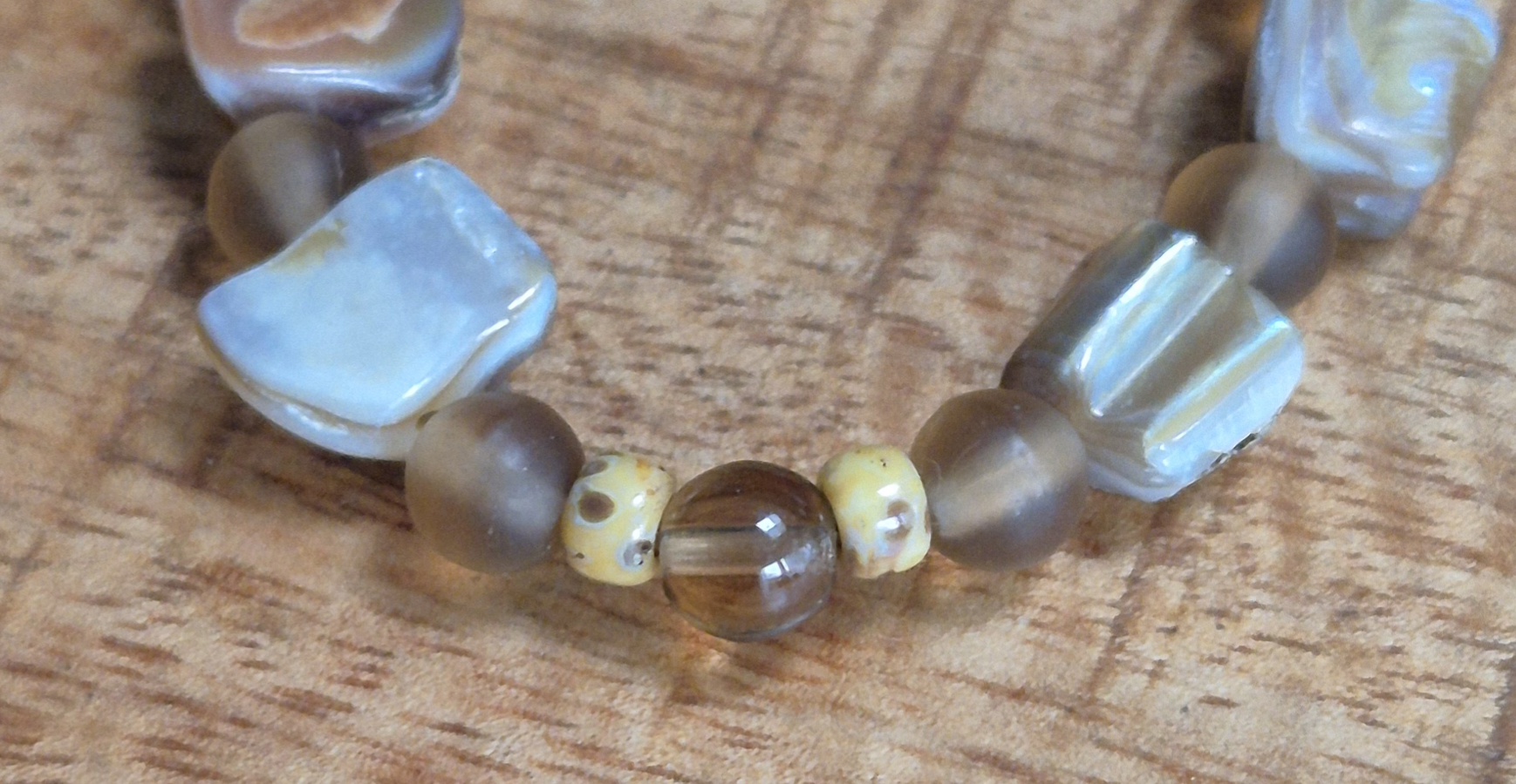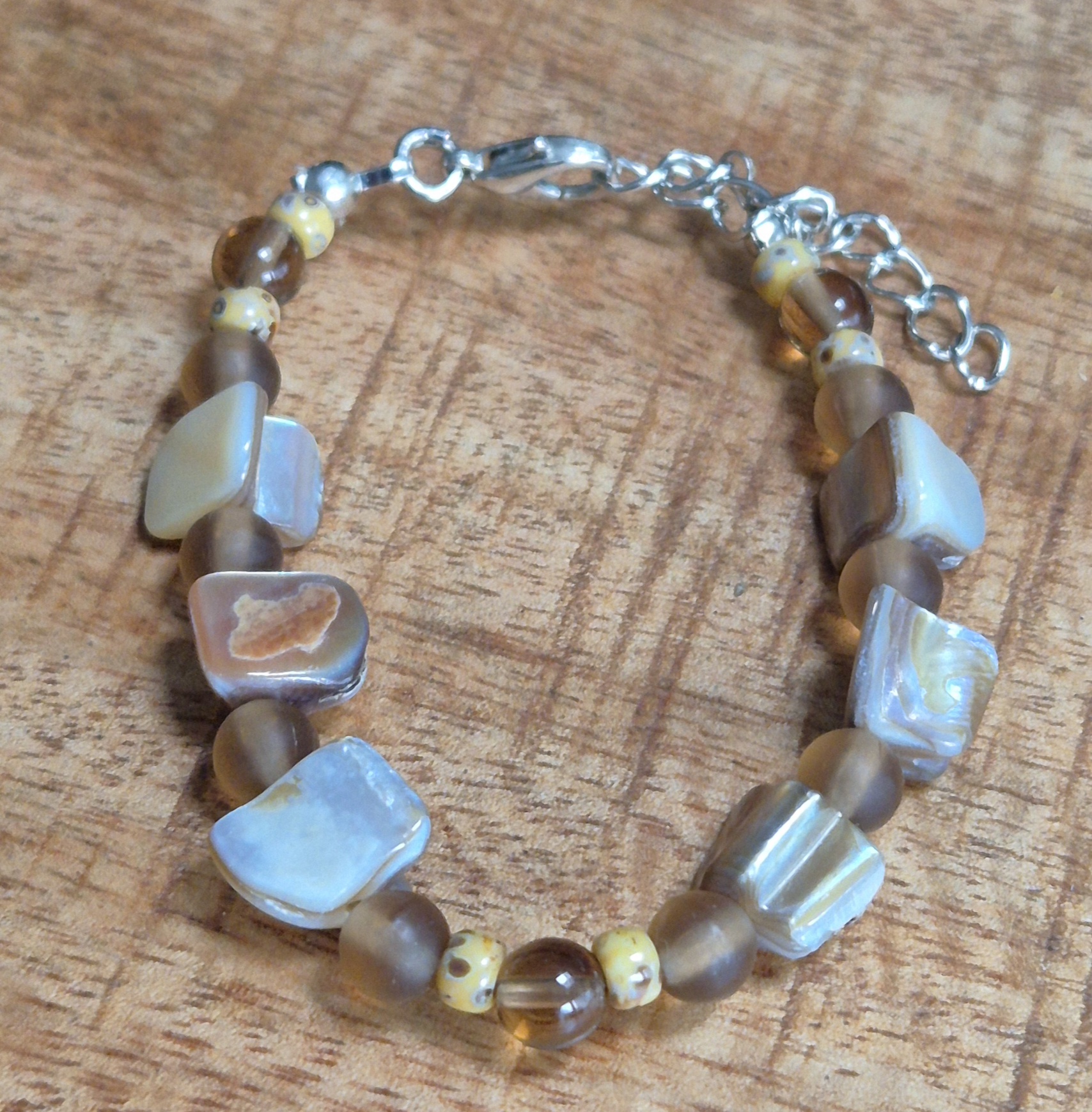 Het armbandje is handgemaakt van bruine glaskralen, miyuki rocailles en schelpkralen, wat zorgt voor een unieke en elegante uitstraling. De armband is voorzien van een zilverkleurige sluiting met een verlengketting, waardoor het geschikt is voor een polsmaat van 16cm tot 20cm. Met dit armbandje voeg je een vleugje stijl toe aan je look en ben je helemaal klaar om te stralen.