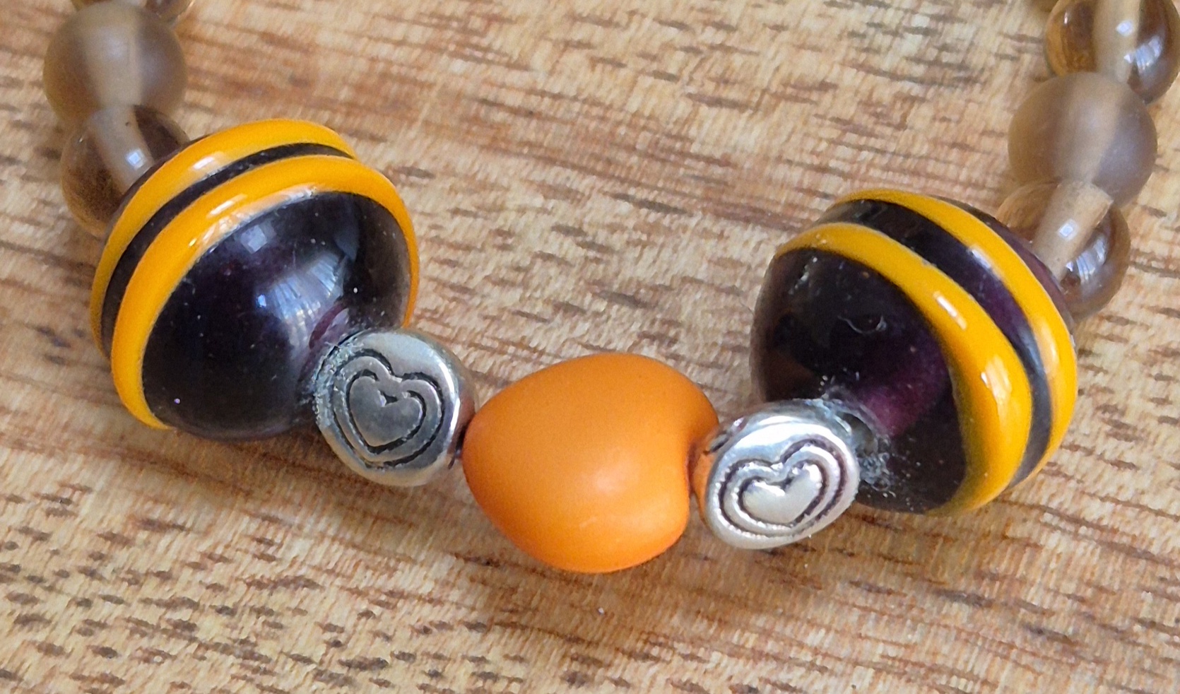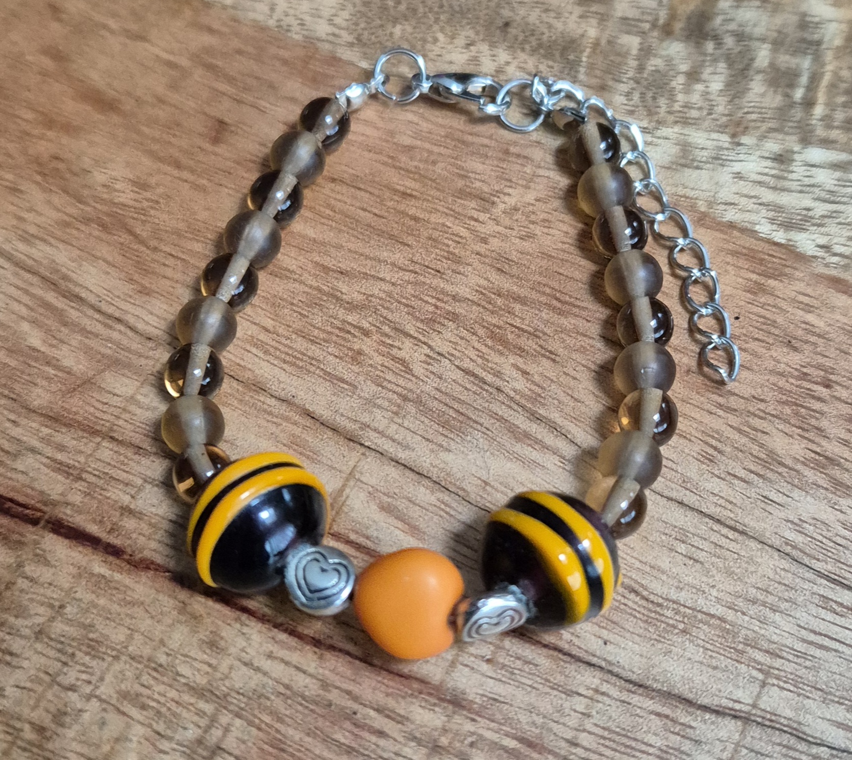 Deze prachtige armband is handgemaakt van bruine glaskralen en is voorzien van een speels oranje acryl hart als eyecatcher. De kralen zijn geregen op stevig Nylon draad en de armband is afgewerkt met een zilverkleurige sluiting met verlengketting. Hierdoor is de armband eenvoudig verstelbaar en geschikt voor een polsmaat van 18cm tot 22cm.