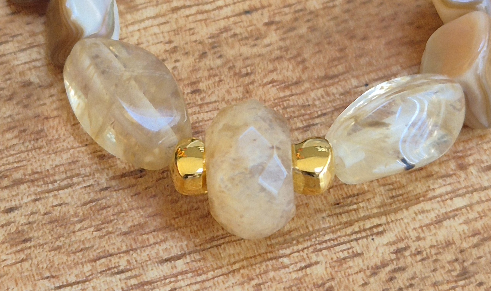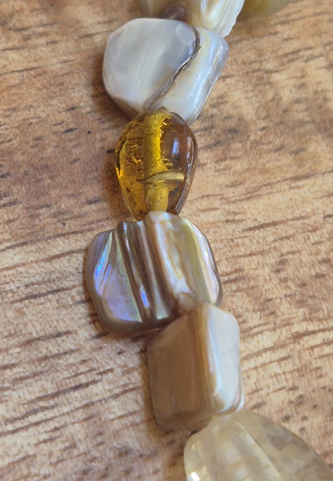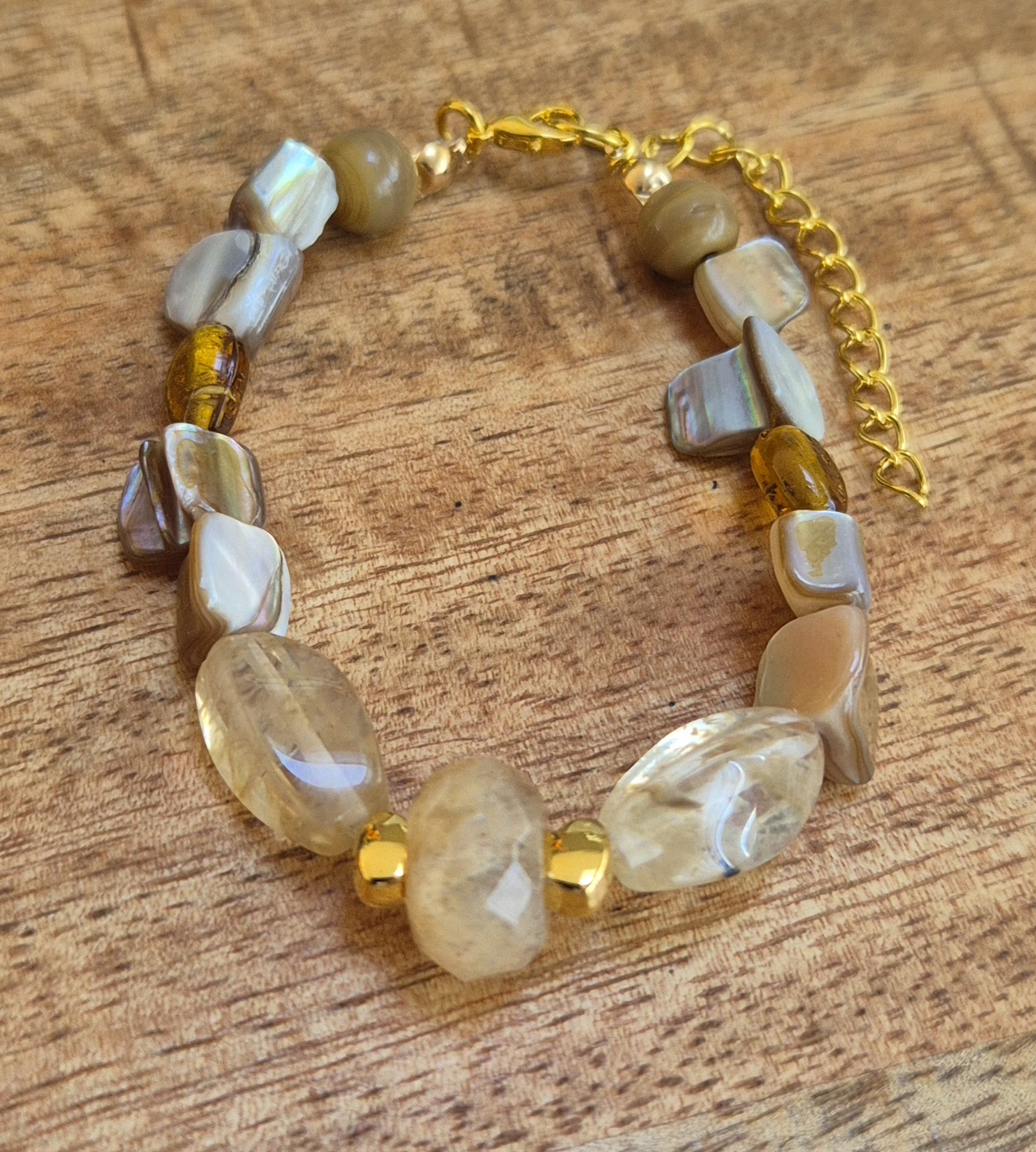 Deze armband is samengesteld uit schelp kralen, mooie grotere citrien kralen, bruine glaskralen en twee goudkleurige metalen hartjes. De armband heeft een goudkleurige sluiting met verlengketting waardoor deze geschikt is voor polsmaten van 18cm tot 23cm. De warme bruine en natuurtinten van de armband zorgen voor een elegante en stijlvolle uitstraling. Of je nu op zoek bent naar een accessoire voor een feestelijke gelegenheid of gewoon om je dagelijkse outfit op te fleuren, deze Citrien armband zal zeker in de smaak vallen.