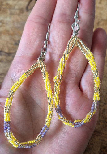 De oorbellen zijn gemaakt van zilverkleurig wiredraad met daaraan gele rocailles, goudkleurige rocailes en zirkonia paarse kralen geregen. Het wiredraad is op een speelse manier om elkaar heen gedraaid, wat zorgt voor een leuk en bijzonder effect. Met een lengte van 8,5cm zijn deze oorbellen echte eyecatchers die elke outfit een vrolijke en trendy touch geven.