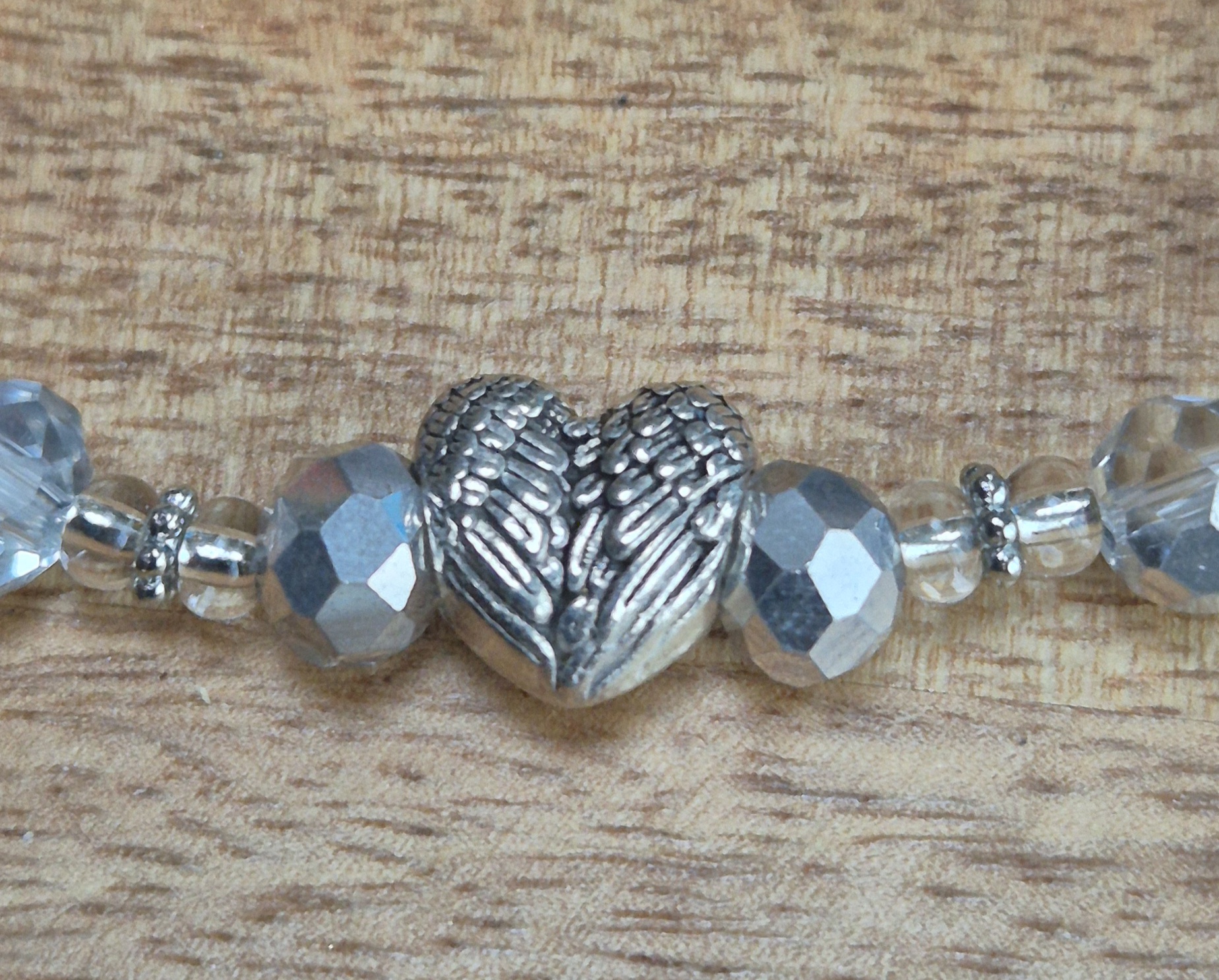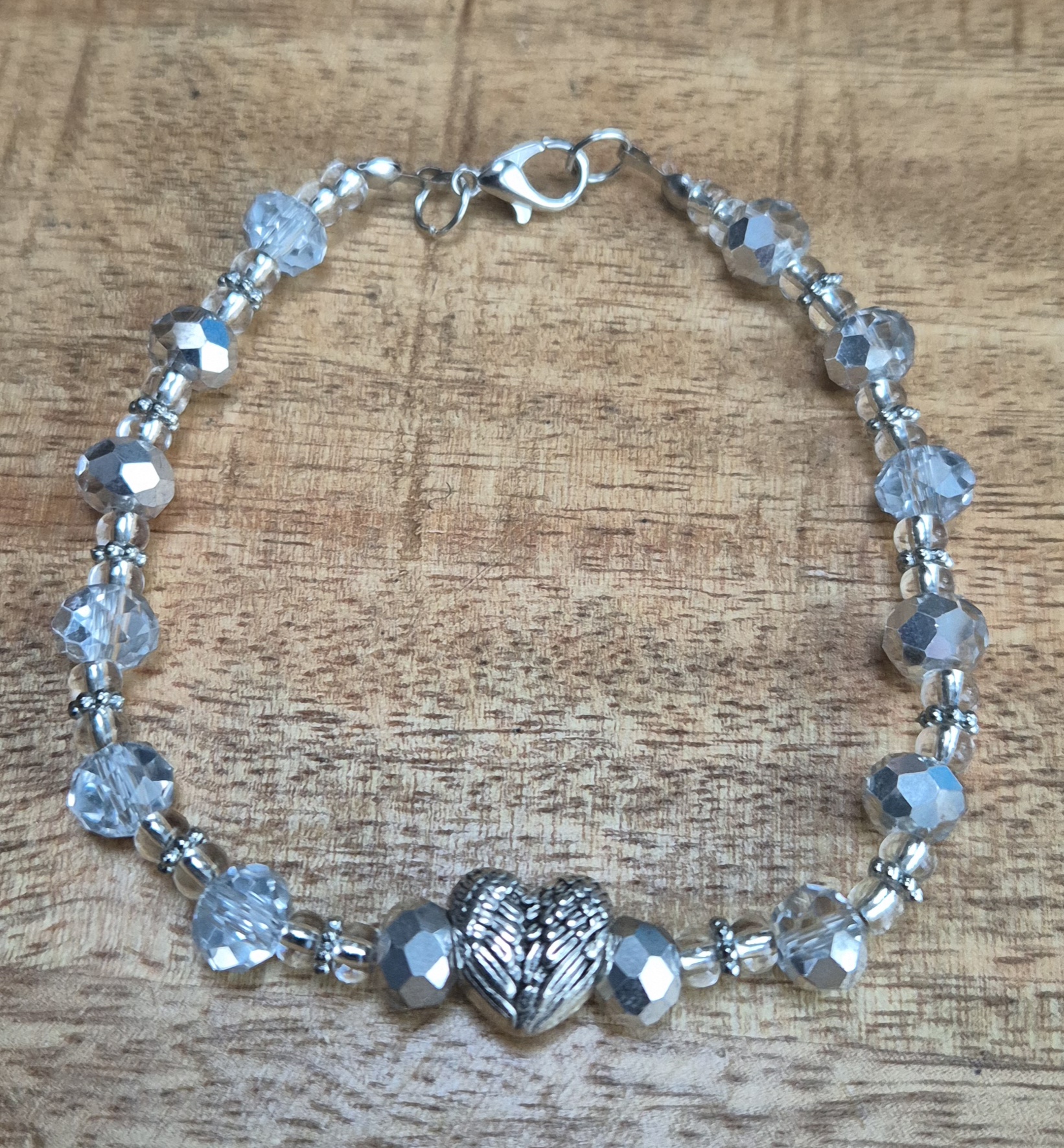 Dit prachtige glazen armbandje met een hartvormig zilverkleurig metalen bedeltje is een must-have accessoire voor elke vrouw. Het armbandje is gemaakt van kristallen rondellen en rocailles en is geregen op stevig nylondraad. De zilverkleurige sluiting zorgt ervoor dat de armband veilig om de pols blijft zitten. Met een lengte van 20,5 cm is deze armband geschikt voor een gemiddelde polsmaat.