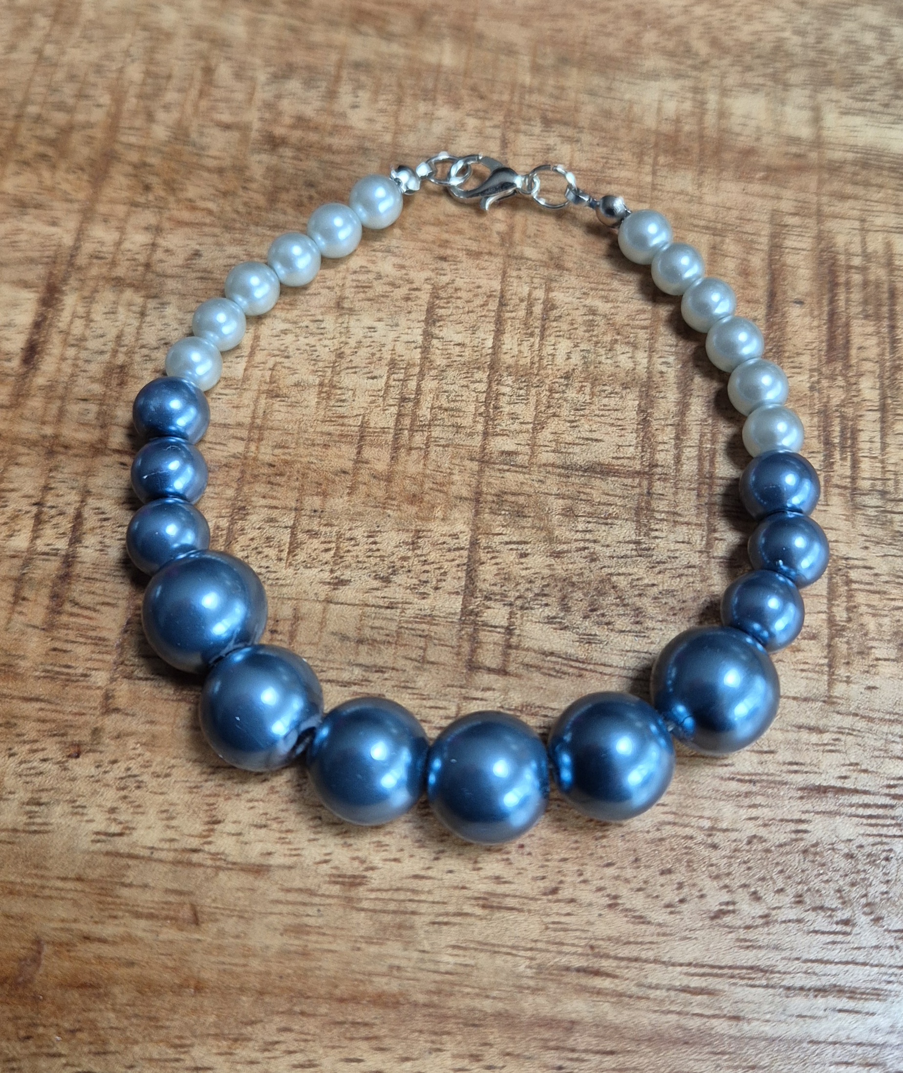 De armband is gemaakt van off White glasparels van 6mm, blauwe glasparels van 8mm en 12mm. De combinatie van verschillende maten en kleuren glasparels zorgt voor een uniek en stijlvol design. De armband is afgewerkt met een zilverkleurige sluiting en is geschikt voor een polsmaat van 20cm. Met deze armband om je pols maak je zeker een statement.