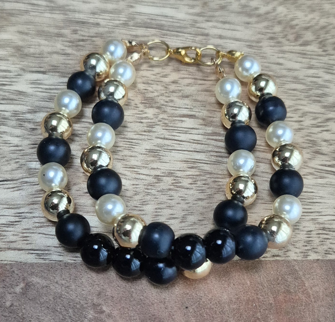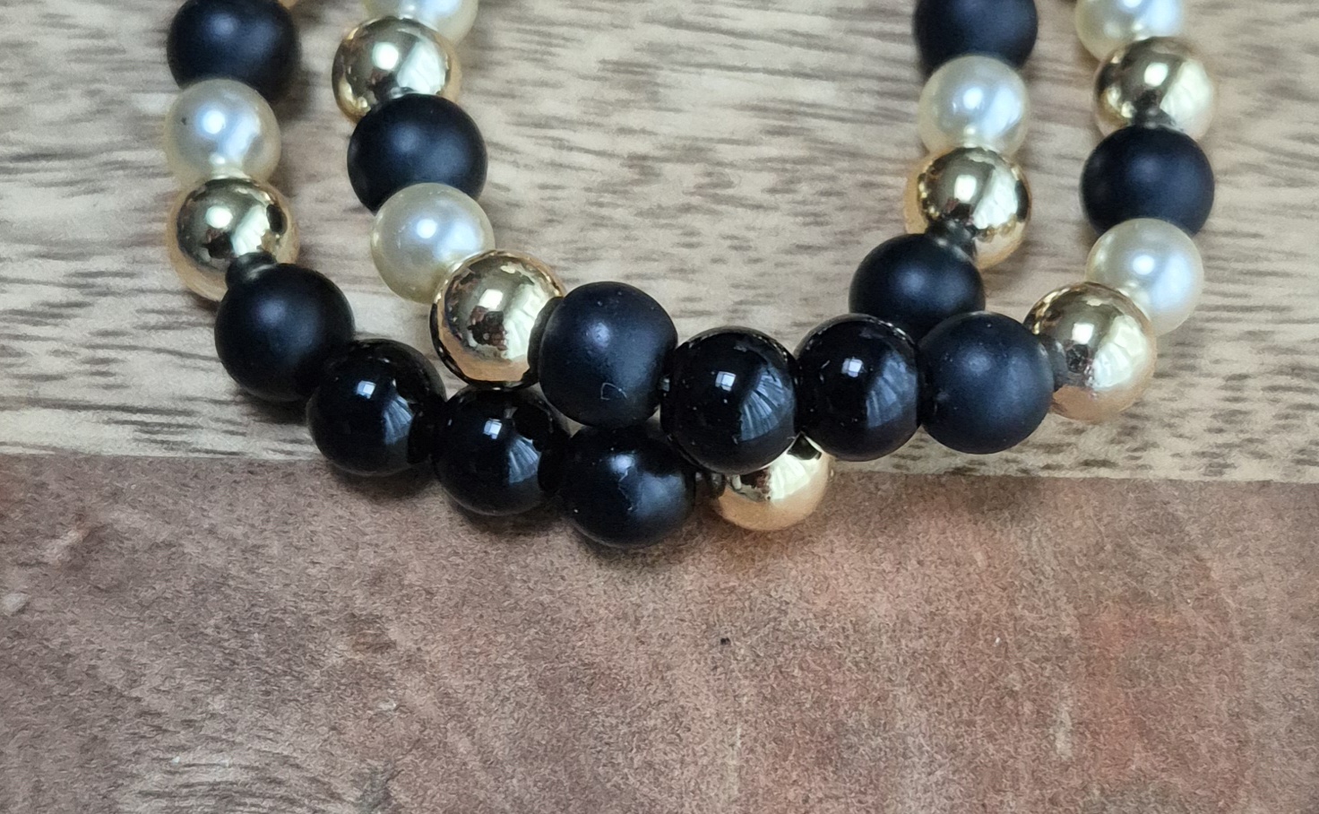 Het armbandje is handgemaakt en bestaat uit 6mm crème kleurige glasparels, 8mm goudkleurige glaskralen en 8mm zwarte glaskralen. Het contrast tussen de verschillende kleuren en maten kralen zorgt voor een unieke en stijlvolle uitstraling. De armband is afgewerkt met een goudkleurige sluiting en is geschikt voor een polsmaat van 16/17cm. Deze armband is een tijdloos stuk dat perfect past bij elke gelegenheid, van casual tot chic.