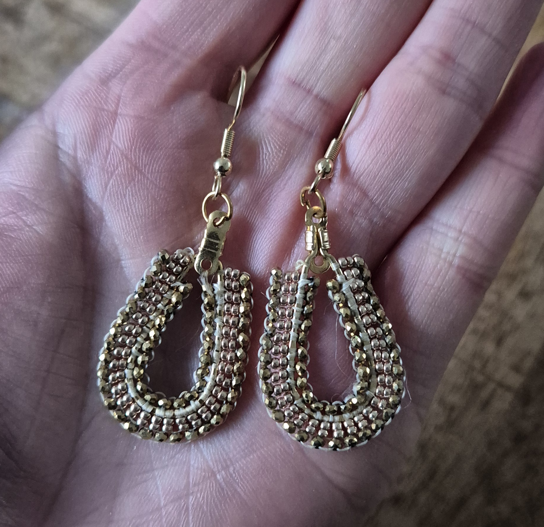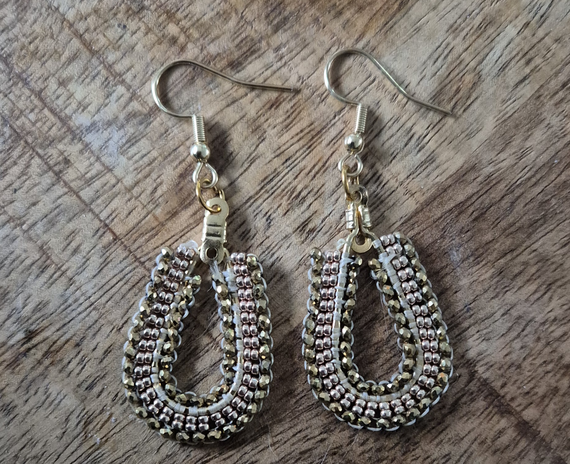 Deze goudkleurige oorbellen zijn voorzien van speelse, handgemaakte hangers van rocailles en 2 mm goudkleurige glasrondellen. De kralen zijn geregen met de brickstitch-techniek, wat zorgt voor een verfijnd patroon en een lichtgewicht, elegante uitstraling. De oorbellen hebben een lengte van 5cm.