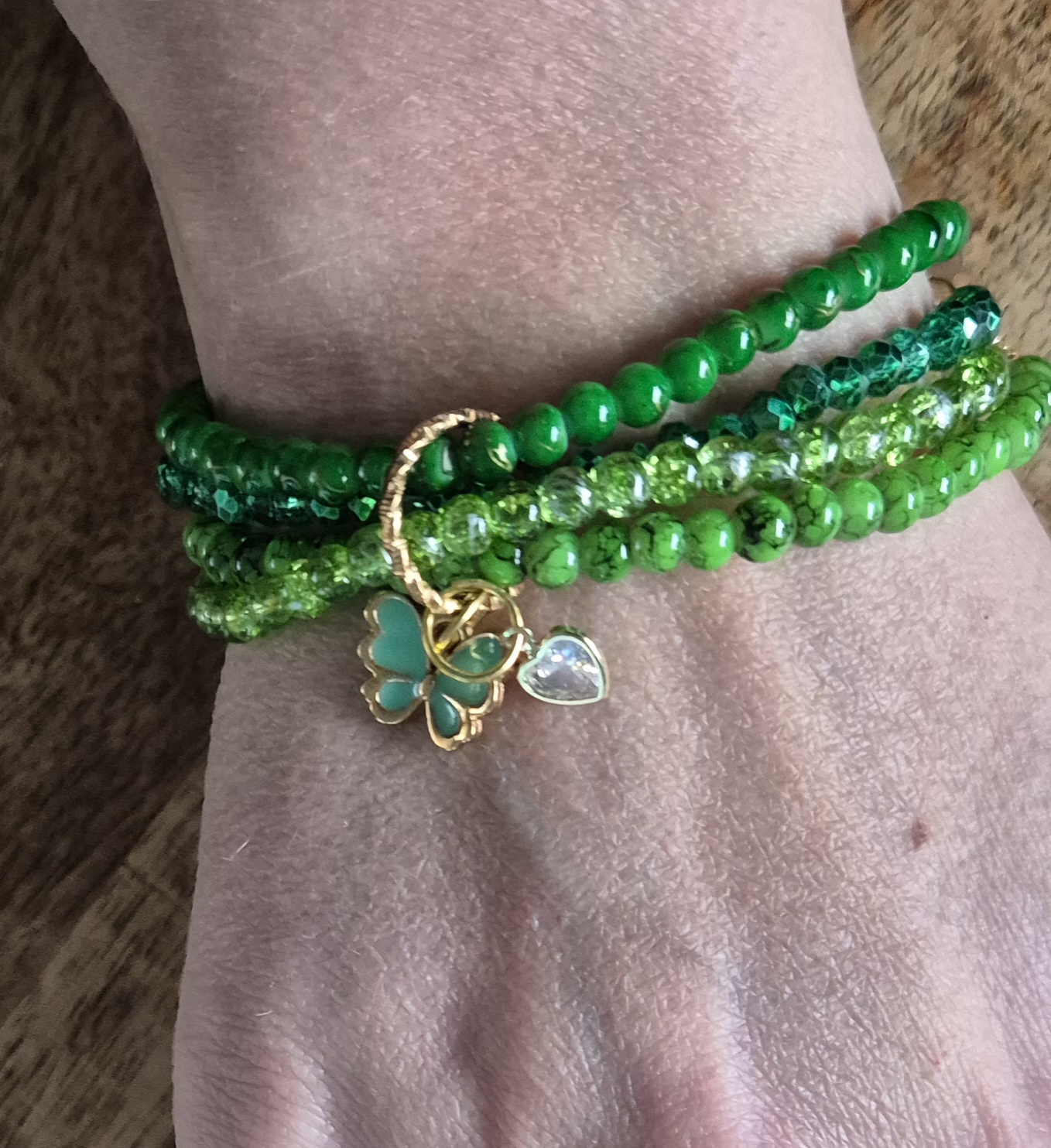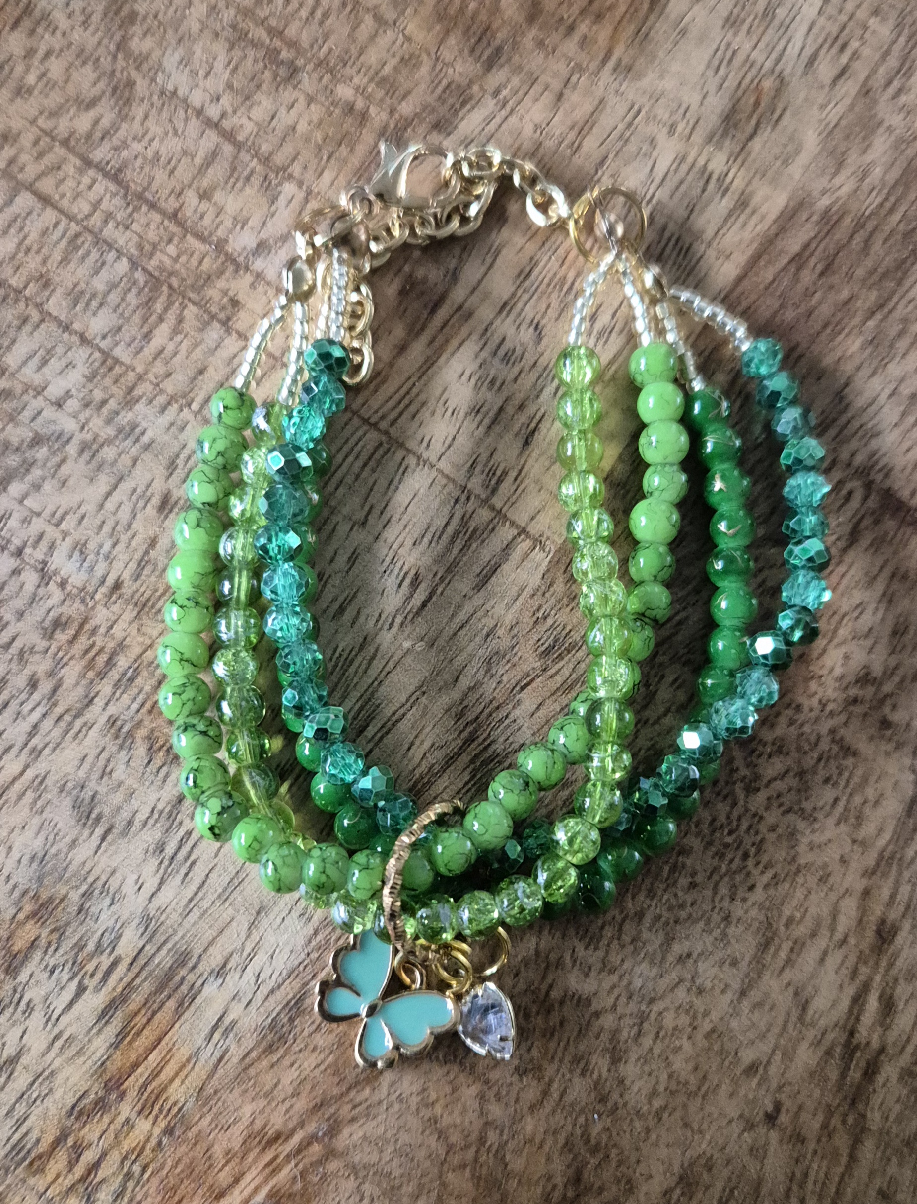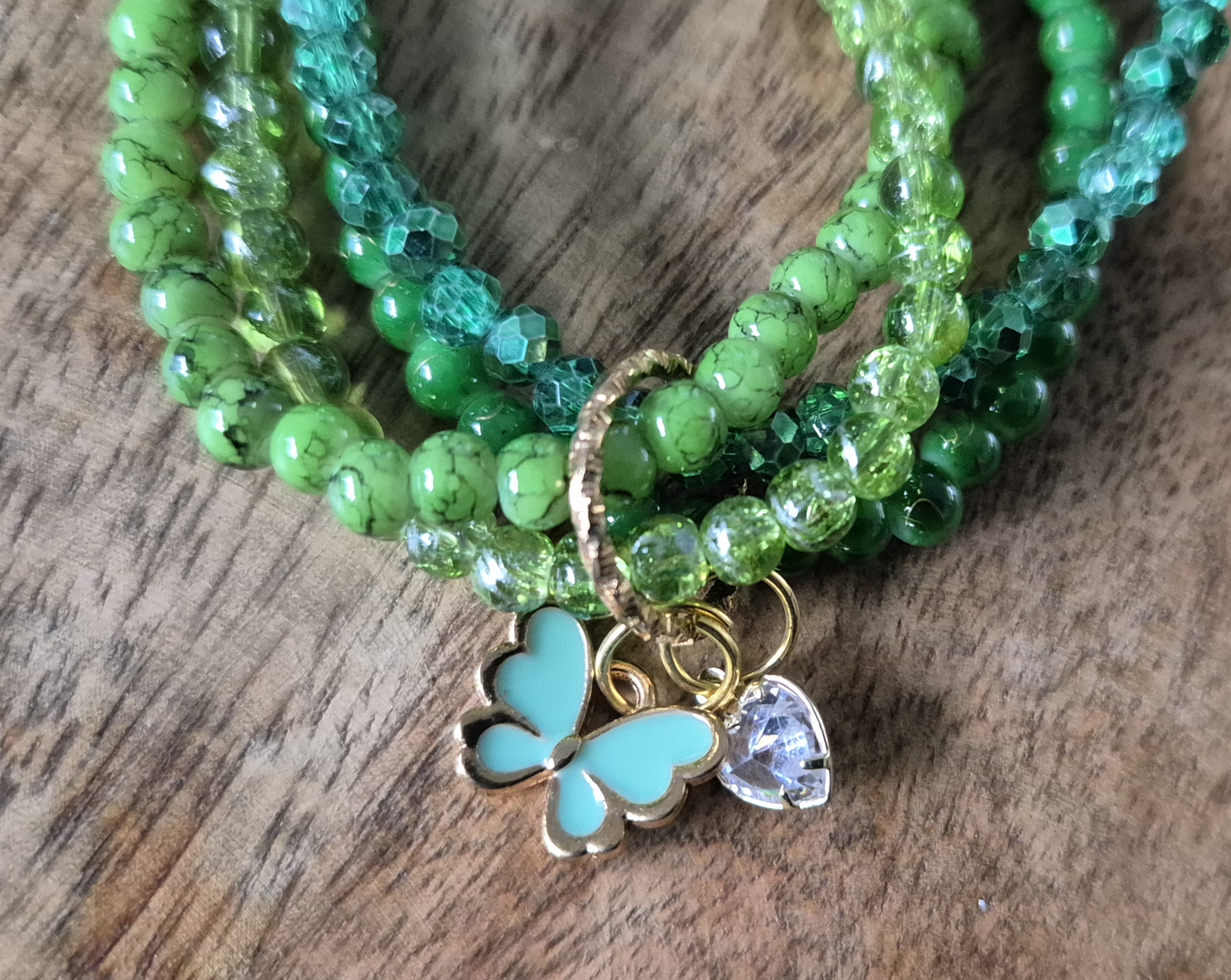 Dit charmante armbandje is samengesteld uit diverse 4 mm groene glaskralen en afgewerkt met een lieve vlinderbedel en een hartjesbedel. De combinatie van de frisse groentinten en de speelse bedels geeft het armbandje een elegante en vrolijke uitstraling.De armband is voorzien van een goudkleurige sluiting met verlengketting, waardoor hij comfortabel te dragen is met een polsmaat van 17 cm t/m 21 cm.