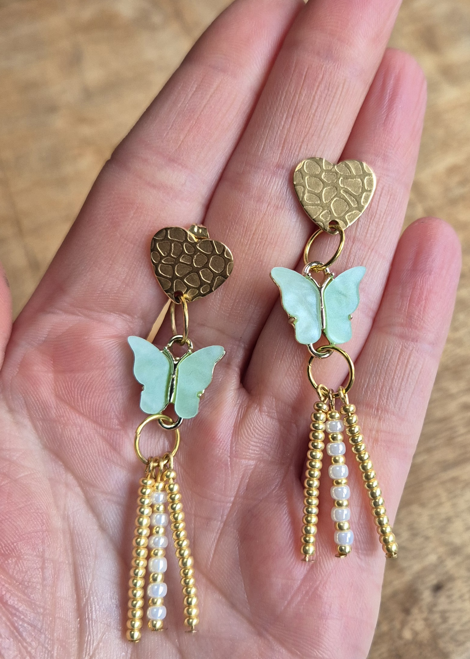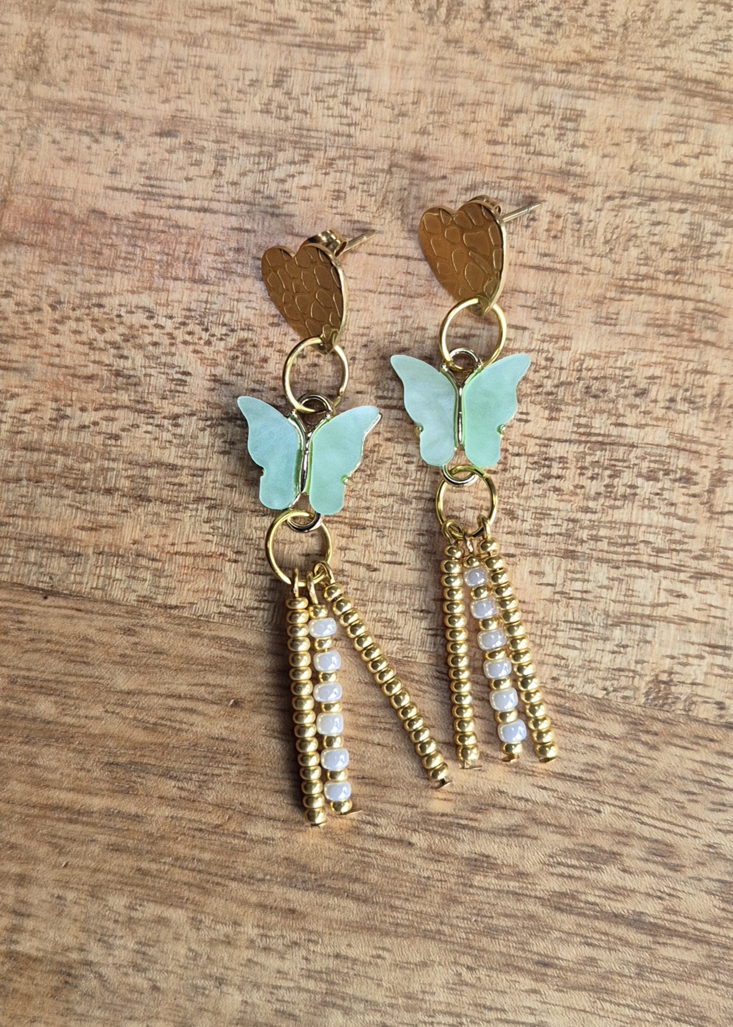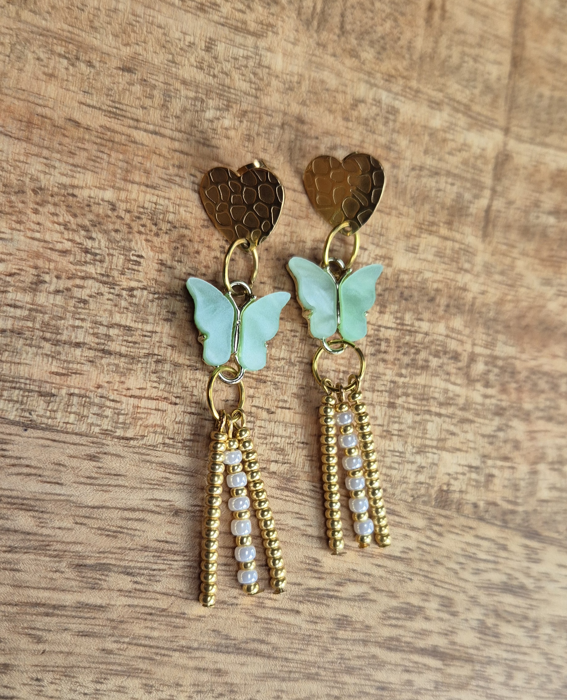 Deze prachtige groene vlinder oorbellen zijn een absolute blikvanger! De goudkleurige hartjes oorstekers zijn versierd met een schitterende groene vlinder, die prachtig afsteekt tegen de witte en goudkleurige rocailles. Met een lengte van 6cm zijn deze vlinder oorbellen elegant en stijlvol, perfect voor elke gelegenheid. Voeg een vleugje kleur en glamour toe aan je outfit met deze unieke en trendy oorbellen. Laat jezelf stralen en trek alle aandacht met deze prachtige groene vlinder oorbellen!