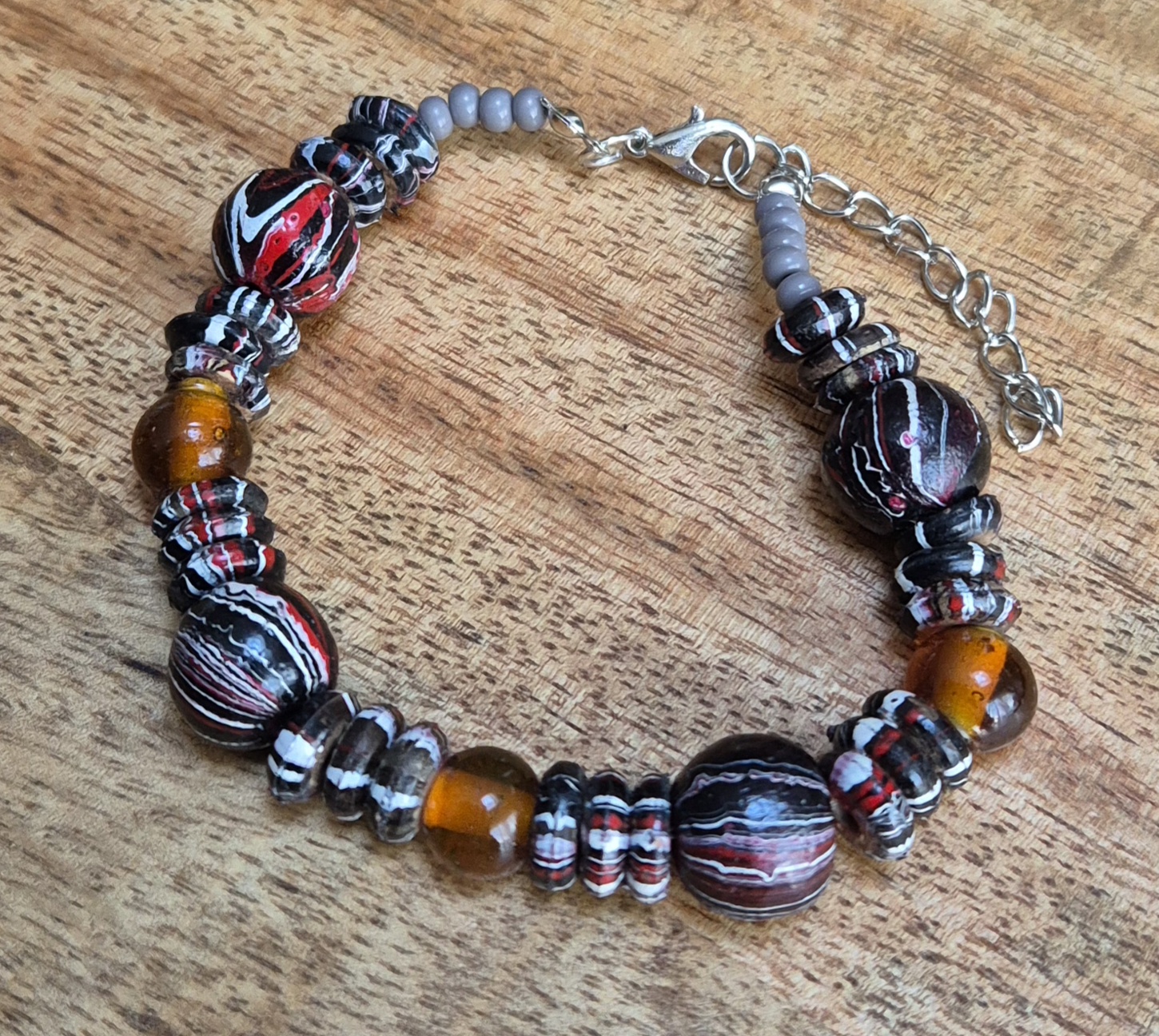 De armband is handgemaakt met diverse houten kralen, grijze rocailles en glaskralen, waardoor deze armband een eigen unieke uitstraling heeft. De armband is geregen op stevig nylondraad en heeft een zilverkleurige sluiting met verlengketting, waardoor deze geschikt is voor een polsmaat van 19,5cm tot 25cm. Met zijn natuurlijke materialen en tijdloze design is deze houten armband een echte eyecatcher die niet mag ontbreken in jouw sieradencollectie.