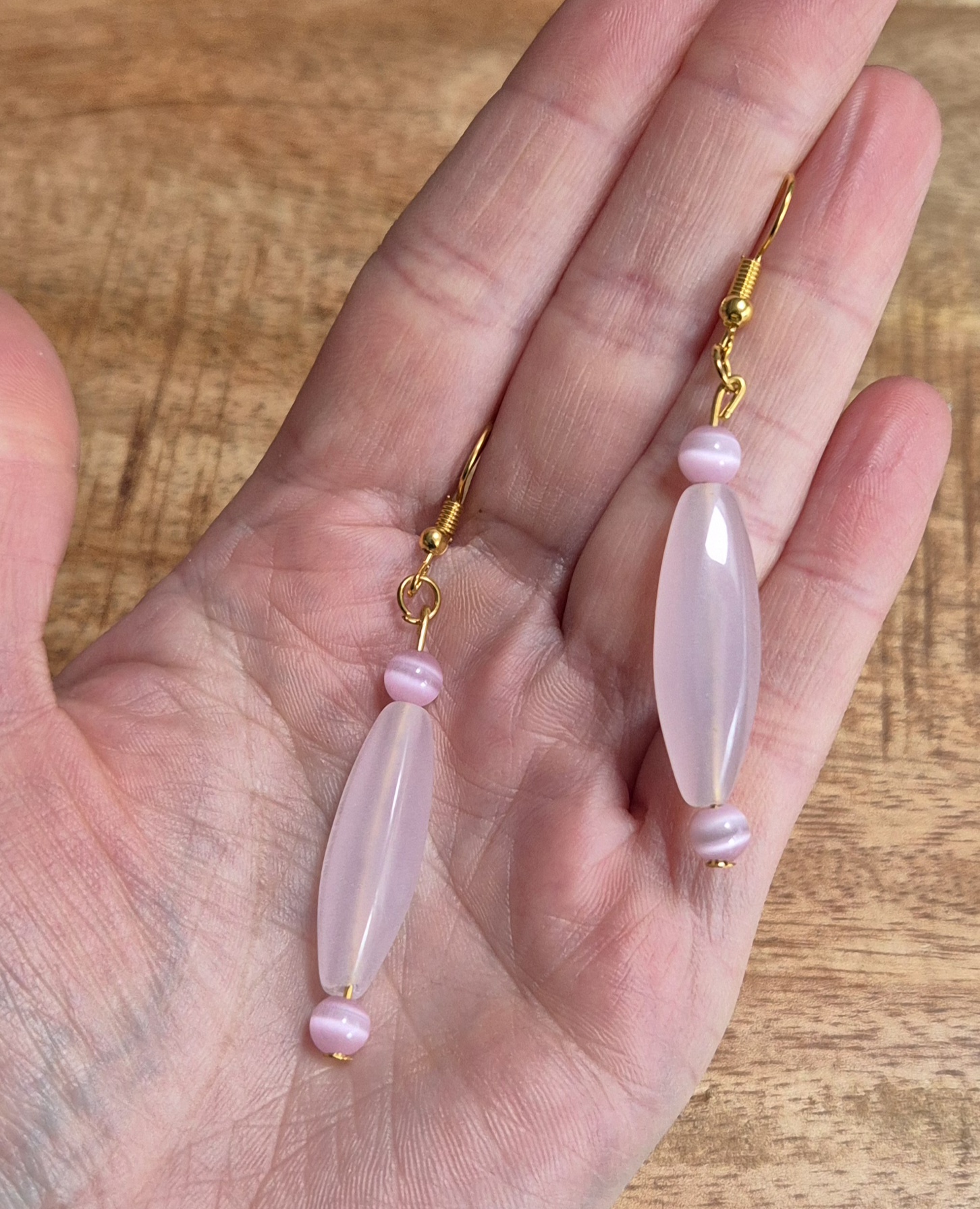 De oorbellen zijn gemaakt van rozenkwarts en cateye kralen, die samen een harmonieus en verfijnd effect creëren. De goudkleurige oorhaak voegt een vleugje luxe toe aan het geheel, terwijl de lengte van 7 cm ervoor zorgt dat de oorbellen opvallen en de aandacht trekken. Of je nu op zoek bent naar een subtiel accessoire voor een casual outfit of een statement piece voor een speciale gelegenheid, deze Rozenkwarts oorbellen zijn de perfecte keuze.