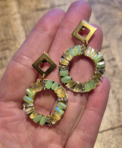 De oorbellen zijn gemaakt van roestvrij staal en hebben een goudkleurige ruitvormig design met daaraan een elegante goudkleurige hanger. De hanger is versierd met prachtige mintgroene en transparant gele kralen, wat zorgt voor een unieke en stijlvolle uitstraling. De oorbellen hebben een lengte van 4cm, waardoor ze subtiel aanwezig zijn maar toch direct de aandacht trekken. Voeg deze trendy oorbellen toe aan je collectie en maak een statement! Deze oorbellen zijn perfect voor elke gelegenheid en zullen zeker complimenten oogsten.