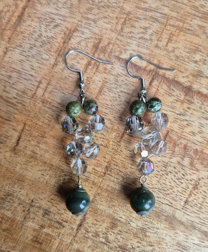 Deze prachtige zilverkleurige oorbellen zijn voorzien van groene natuursteen kralen van 6mm, glazen facetten van 6mm en een ronde 8mm natuursteen hanger. De kralen zijn op een unieke manier geregen, waardoor de oorbellen een speels effect hebben. Met een lengte van 6,5cm zijn deze oorbellen een echte eyecatcher. Perfect voor elke gelegenheid en een mooie toevoeging aan je sieradencollectie.