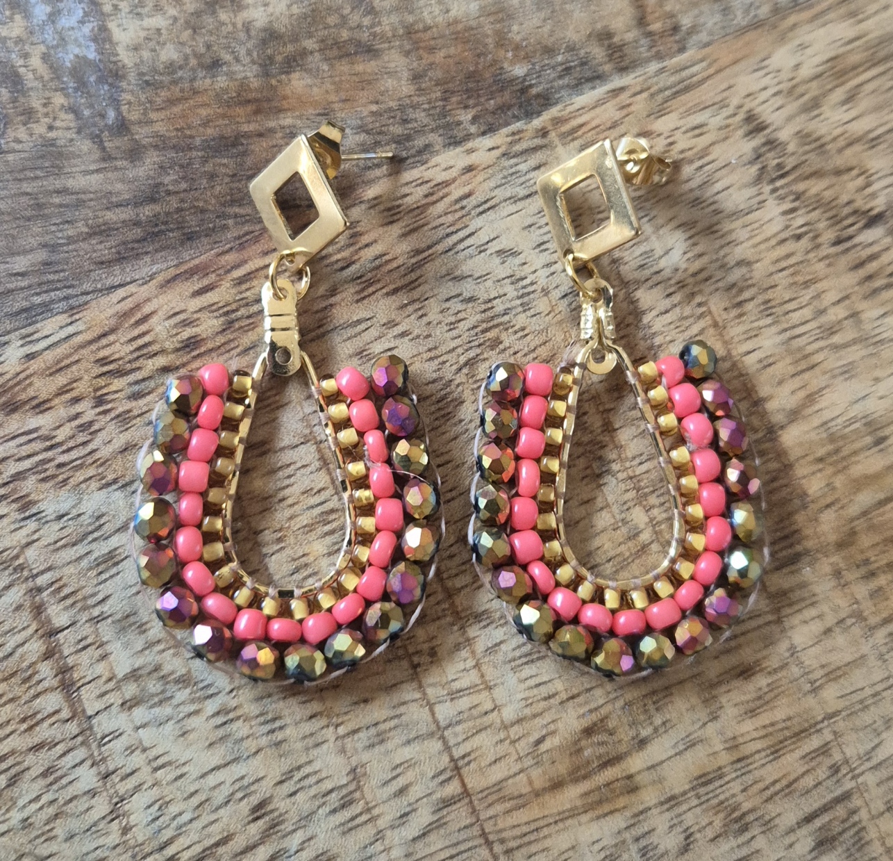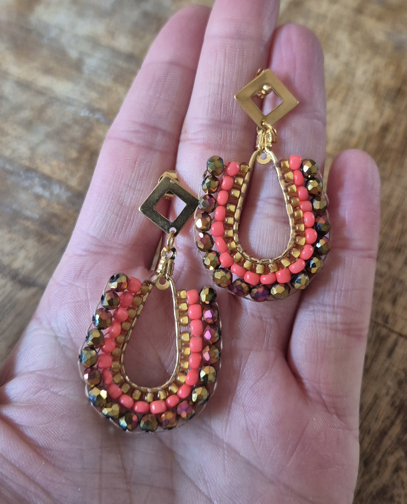 Trendy handgemaakte oorbellen in een elegante U-vorm, afgewerkt met een speelse mix van rocailles en facetkralen. De combinatie van koraal accenten, warme goudtinten en glanzende metallic kralen geeft deze oorbellen een opvallende en stijlvolle uitstraling. De verfijnde afwerking en het lichte draagcomfort maken ze perfect voor dagelijks gebruik of een feestelijke look.