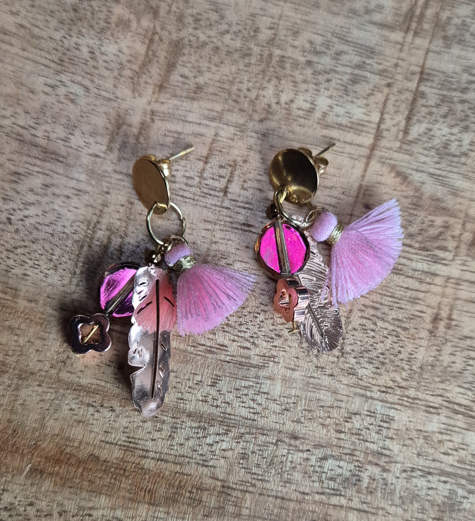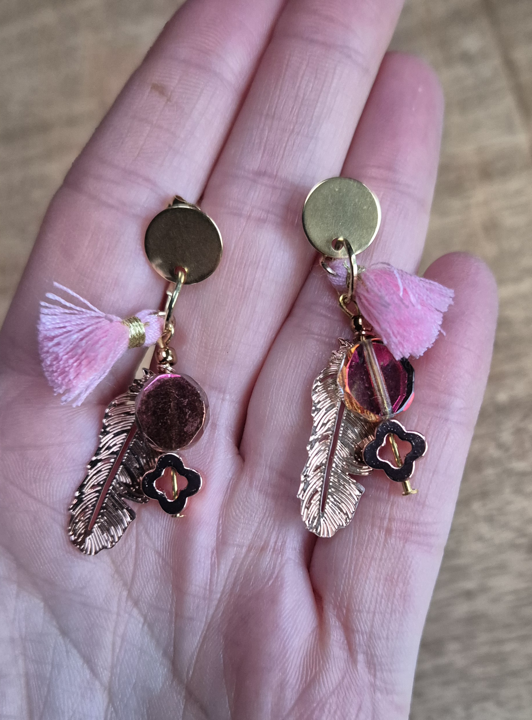 Deze prachtige oorbellen bestaan uit ronde goudkleurige RVS oorstekers met daar aan een rosé kleurige blad bedel, een roze kwastje, een Tsjechische glaskraal en een rosé kraal. Deze unieke combinatie van materialen en kleuren zorgt voor een speelse en stijlvolle uitstraling. Met een lengte van 5 cm zijn deze oorbellen perfect om subtiel de aandacht te trekken. Draag ze naar een feestje, een dagje uit of gewoon naar je werk en geef je look een trendy touch! Bestel ze nu en voeg deze eyecatchers toe aan je sieradencollectie.