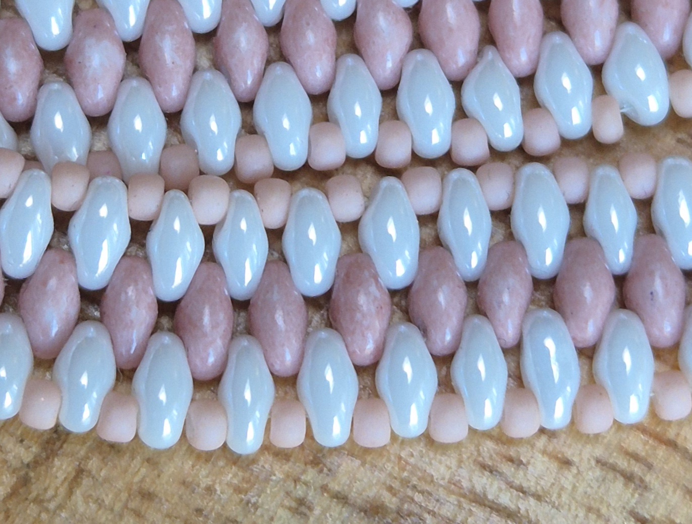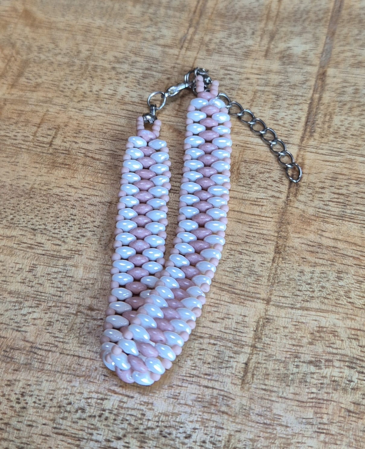 Dit zomerse armbandje is bestaat uit witte en oudroze SuperDuo glaskralen en heeft een speels, uniek rijgpatroon dat zorgt voor een elegante uitstraling. De zilverkleurige sluiting is voorzien van een verlengketting, waardoor het armbandje eenvoudig verstelbaar is. Geschikt voor een polsomtrek van 17 cm tot en met 21,5 cm.