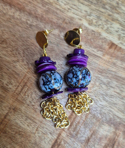 De oorbellen zijn versierd met paarse schelpkralen en een grote ronde glaskraal van 10mm, wat zorgt voor een unieke en stijlvolle uitstraling. Daarnaast zijn er speelse goudkleurige kettinkjes toegevoegd voor een extra leuk effect. Met een lengte van 6cm zijn deze oorbellen een echte eyecatcher die je outfit compleet maken. Of je ze nu draagt naar een feestje of gewoon naar je werk, deze oorbellen zijn altijd een goede keuze.