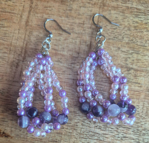 Aan de zilverkleurige oorhangers zijn in elkaar geweven wiredraden, met daarop geregen verschillende roze en paarse glaskralen. Hierdoor krijg je leuke speelse oorbellen met een unieke uitstraling die zeker de aandacht zal trekken. Met een lengte van 7 cm zijn deze oorbellen perfect voor zowel overdag als ’s avonds.