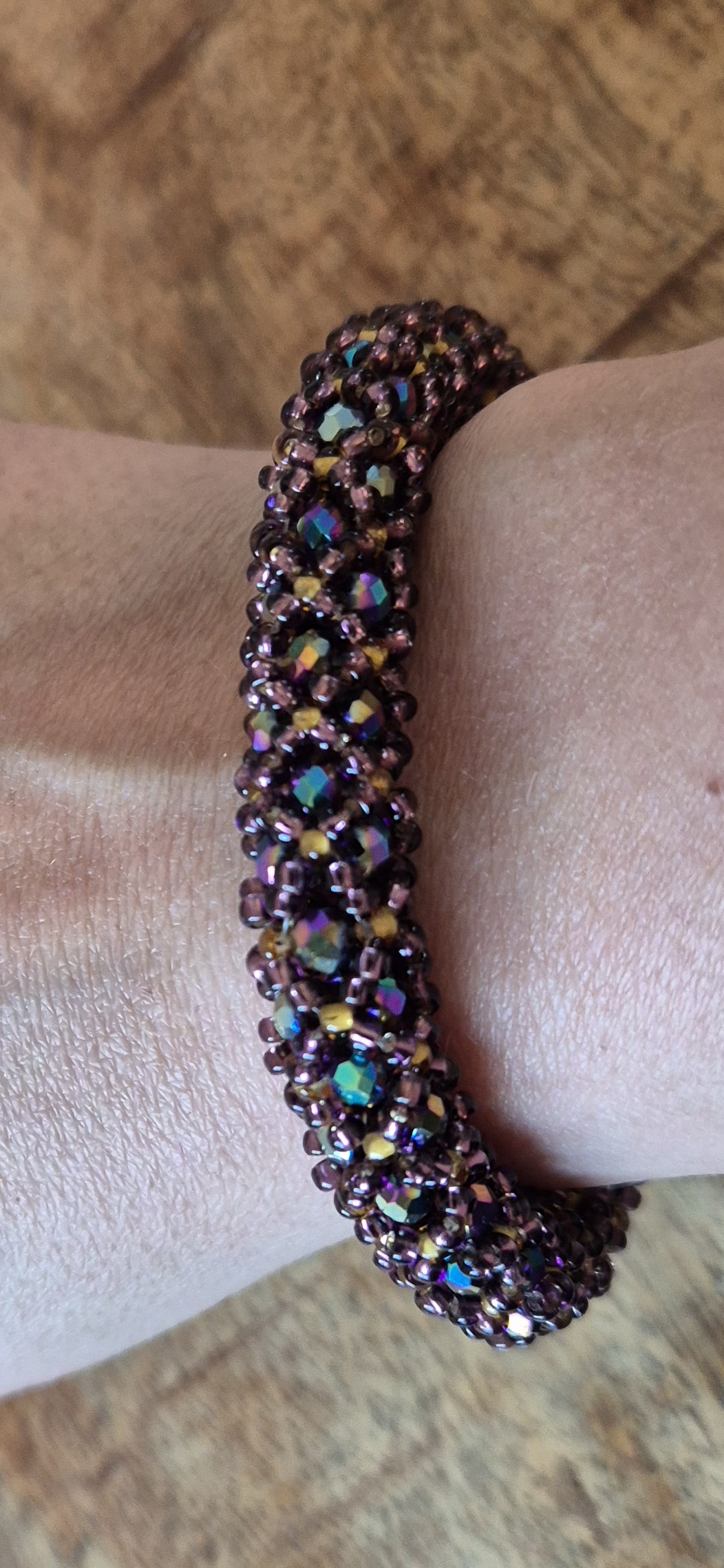 Een armband geregen van 4x3mm glasrondellen en 11/0 rocailles, die je om kunt doen doormiddel van het rollen over de hand. Te dragen tot een polsmaat van 19cm.