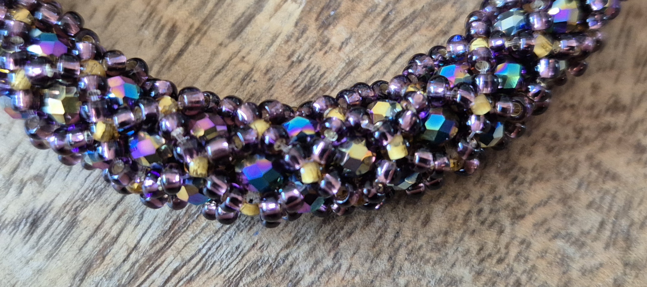 Deze prachtige armband straalt kleur en elegantie uit dankzij de rainbowkleurige 4x3mm glasrondellen, gecombineerd met paarse en goudkleurige rocailles. De unieke rijgtechniek geeft de armband een speels maar verfijnd karakter.