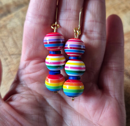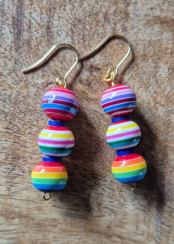 Deze oorbellen hebben goudkleurige oorhaken met daaraan drie grote gekleurde regenboog kralen. De verschillende kleuren in de oorbellen maken ze perfect om te combineren met allerlei outfits. Of je nu een zomerse jurk draagt of een casual jeans met een T-shirt, deze oorbellen passen er altijd bij! Met een lengte van 5,5cm zijn deze oorbellen een opvallende en stijlvolle toevoeging aan elke look.