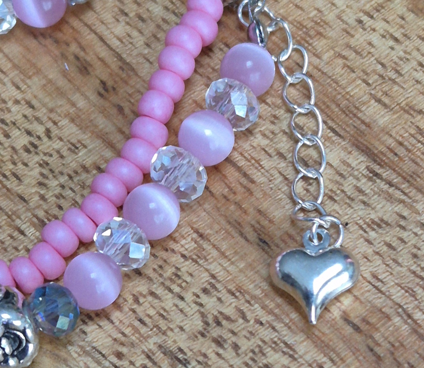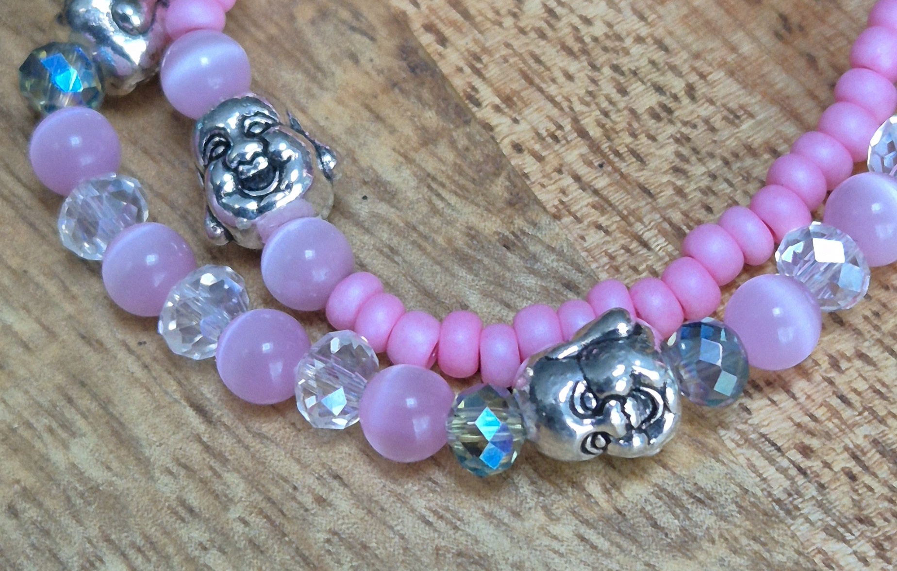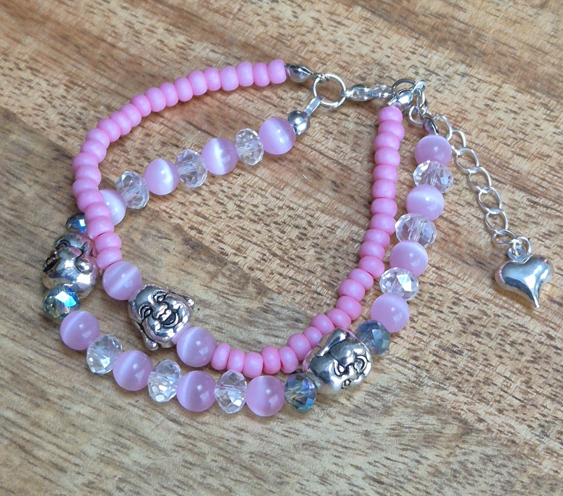 De armband is gemaakt van roze rocailles en is voorzien van 6mm glaskralen en drie metalen boeddha kralen. De armband sluit met een zilverkleurige sluiting en heeft een verlengketting, waardoor hij te dragen is met een polsmaat van 16cm t/m 18cm. De subtiele kleuren en de betekenisvolle boeddha details maken deze armband een uniek en stijlvol accessoire dat perfect past bij elke outfit.