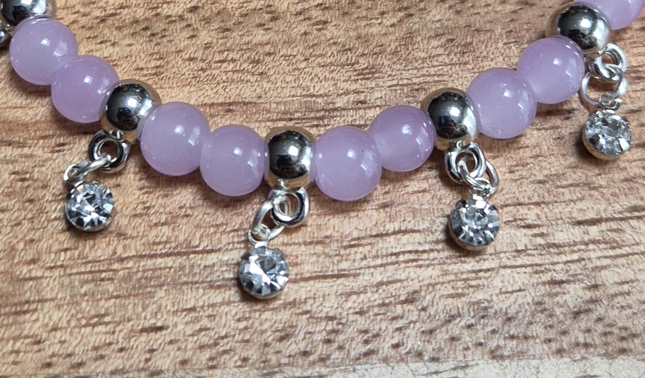 Het armbandje is gemaakt van 6mm roze glaskralen, afgewisseld met zilverkleurige metalen bedeltjes met een fonkelend steentje. De armband is geschikt voor een polsmaat van 17,5cm tot 21cm en is dus perfect passend voor bijna iedereen. Met deze armband om je pols voeg je een vleugje kleur en elegantie toe aan elke outfit. Of je nu gaat voor een casual look of een chique avond uit, deze roze glaskralen armband is een prachtige toevoeging aan jouw sieradencollectie.