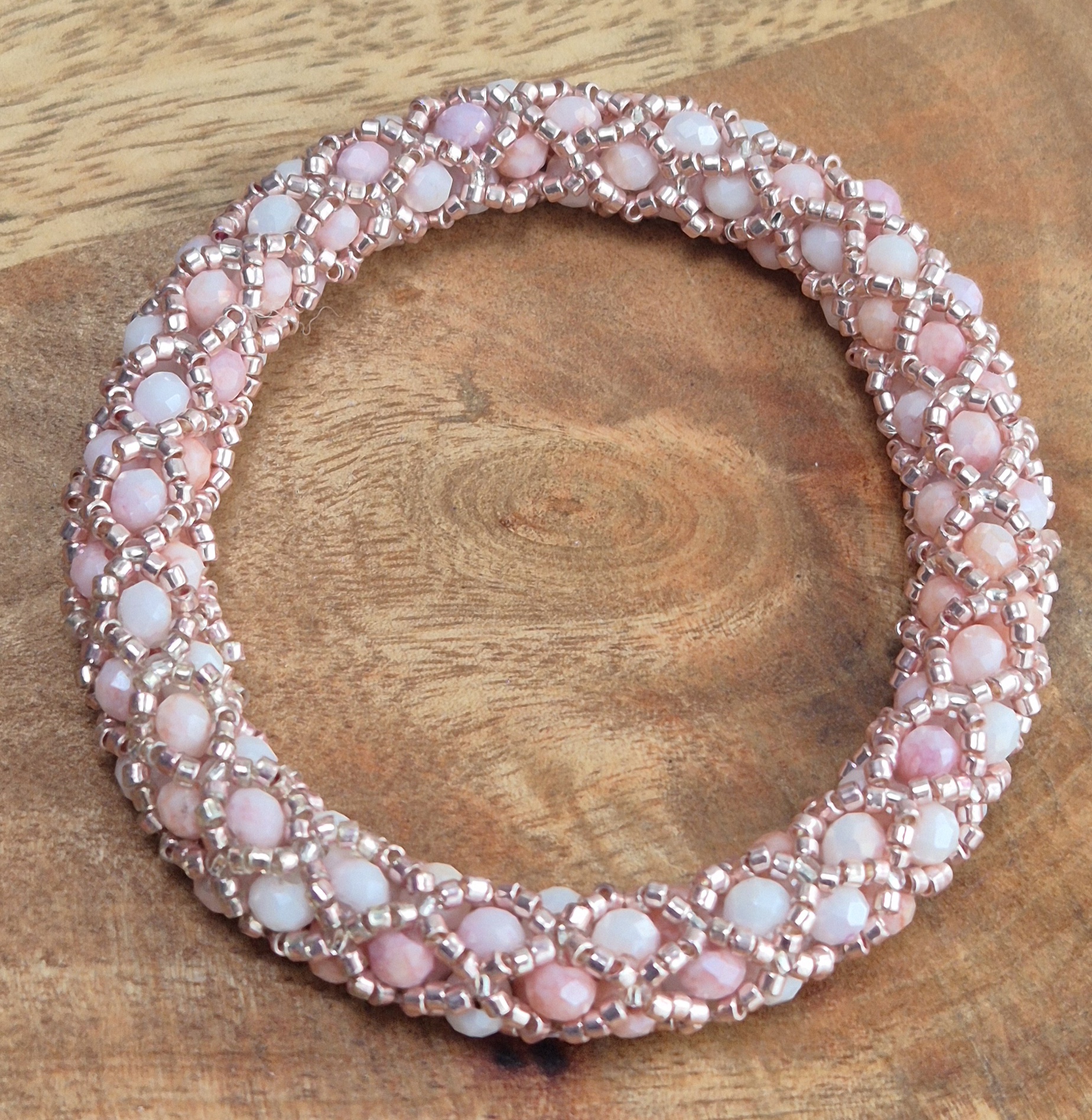 De armband is met liefde geregen op nylondraad en bestaat uit 4x3mm glasrondellen in verschillende mooie roze tinten, aangevuld met ToHo 11/0 treasurebeads en ToHo 11/0 round beads voor een unieke uitstraling. De armband is gemakkelijk om te doen door hem simpelweg over je pols te rollen. Met een ruime pasvorm van 17cm tot 19,5cm past deze armband om de pols van de meeste vrouwen.