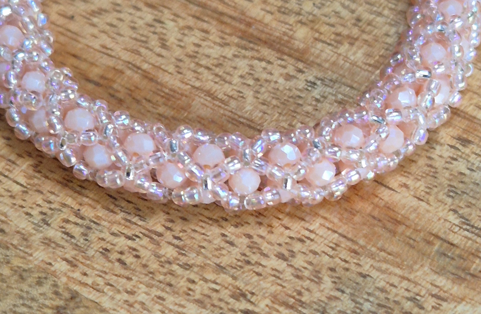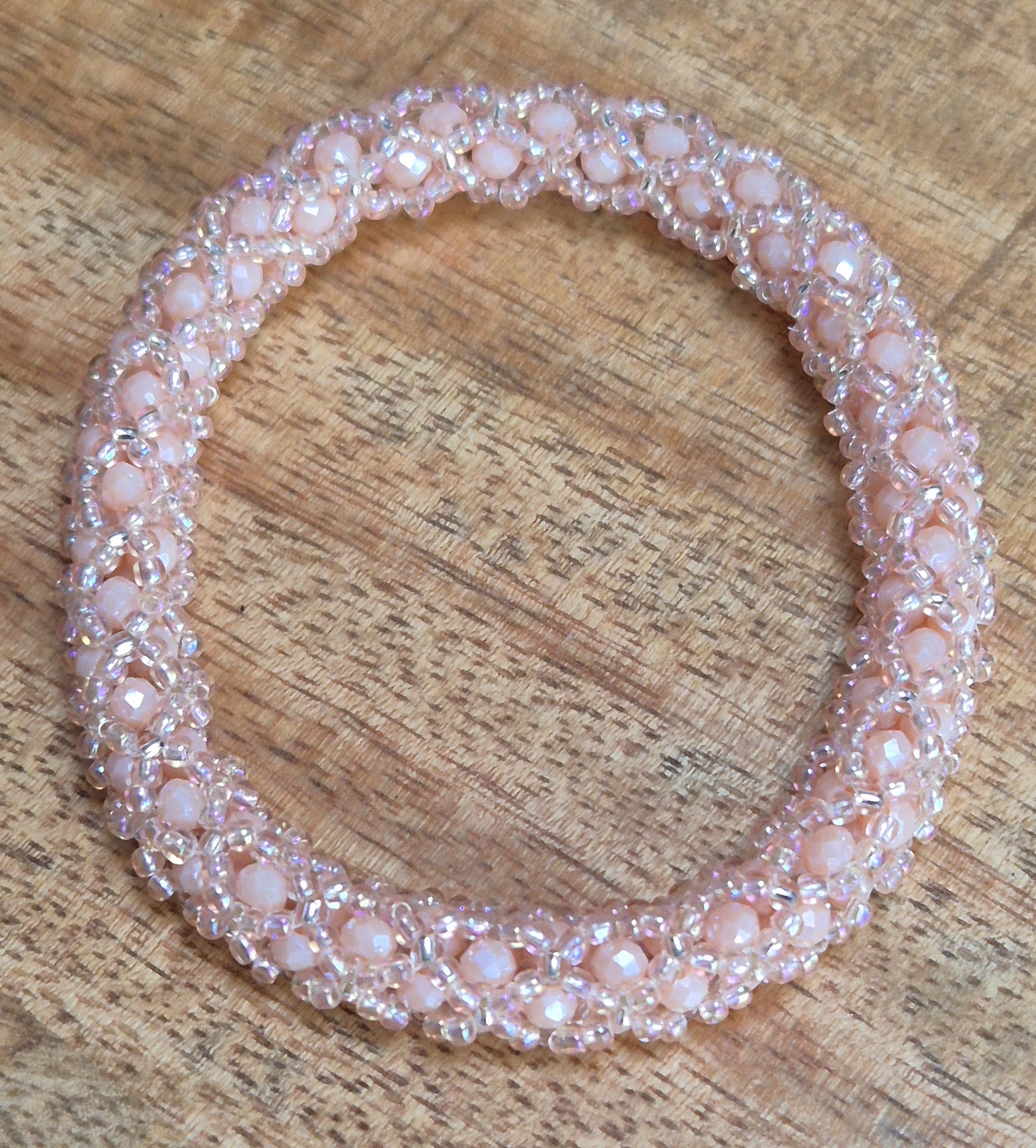 Deze prachtige lichtroze roll-over armband is gemaakt van 3x2mm zalmroze glasrondellen, 11/0 roze ToHo round beads en 11/0 transparante ToHo round beads. De armband heeft geen sluiting en kan eenvoudig om de hand worden gerold. De armband is geschikt voor polsmaten van 17cm tot 19,5cm.