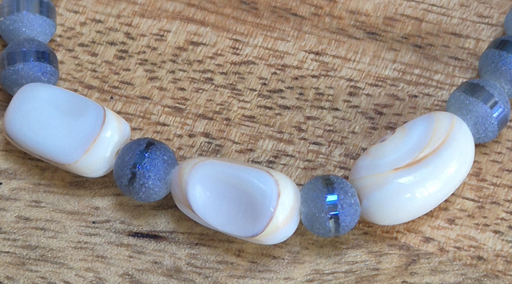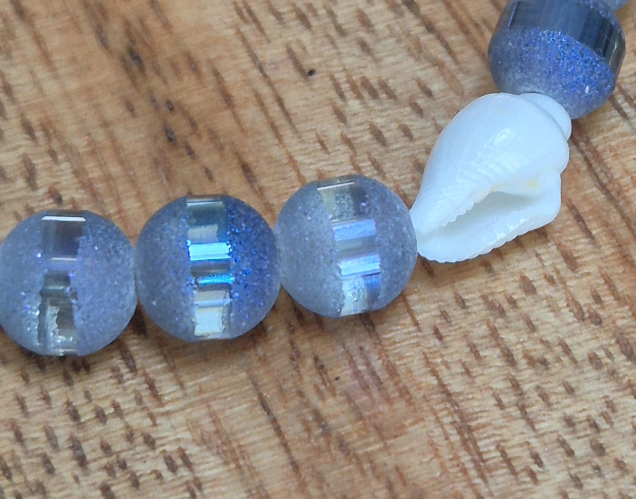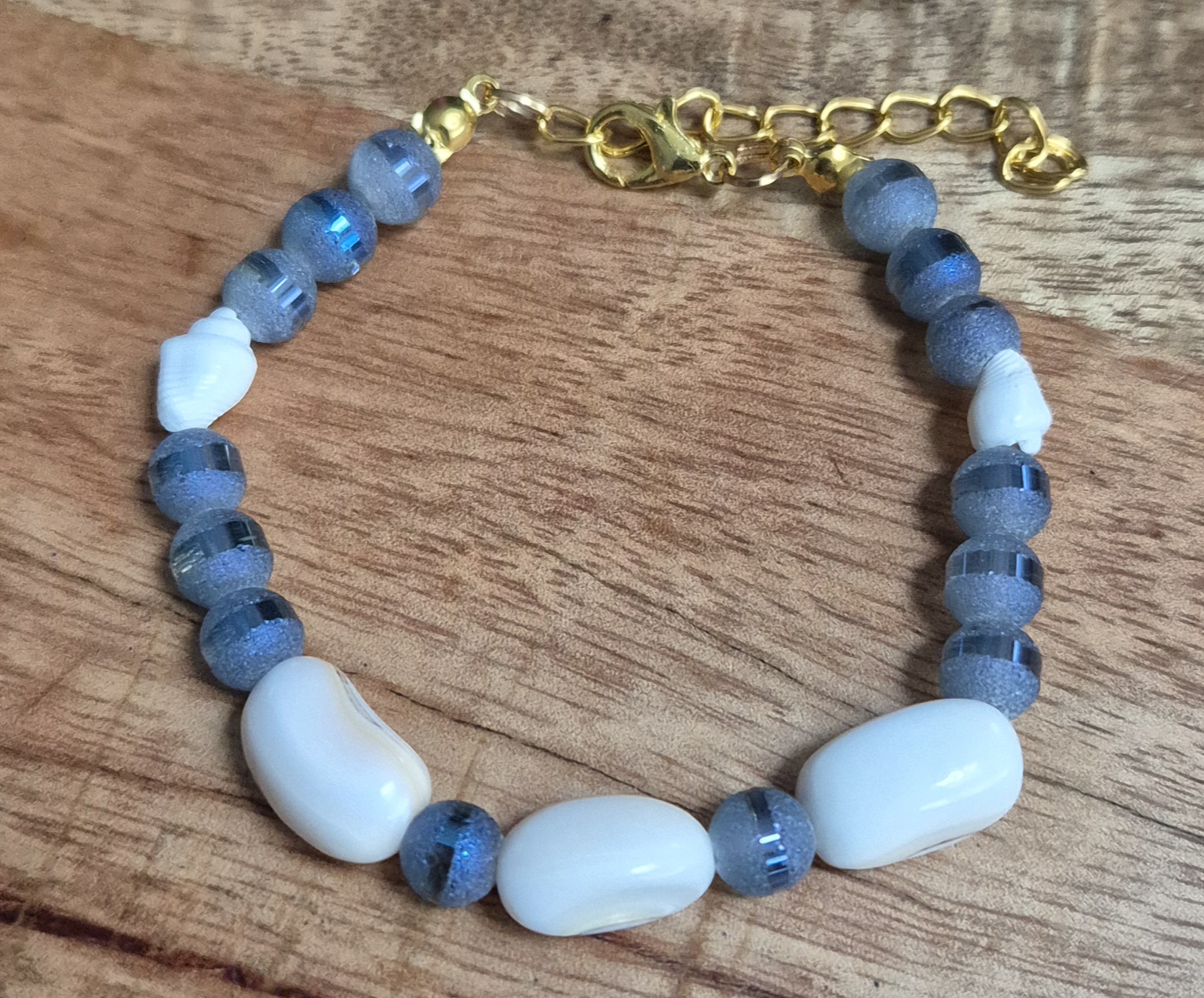 De armband is handgemaakt en bestaat uit glaskralen van 6mm in een mooie diepblauwe kleur. Daarnaast zijn er drie grote schelpkralen en twee kleine schelpkralen toegevoegd voor een speels effect. De armband sluit met een goudkleurige sluiting en heeft een verlengketting, zodat je de maat kunt aanpassen. De armband is geschikt voor een polsmaat van 17,5cm tot 21,5cm.