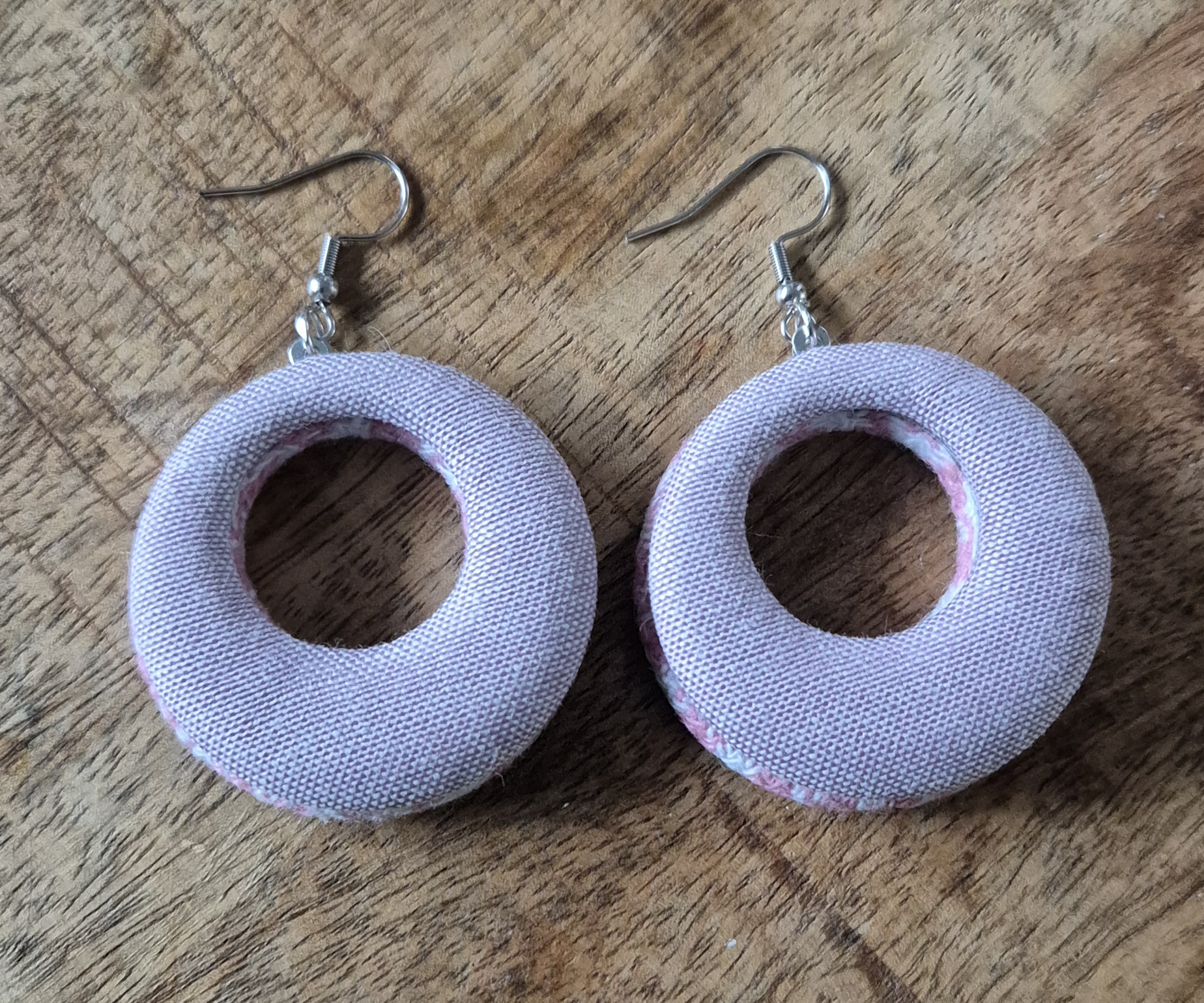 Unieke oorbellen met stoffen hangers in zachte tinten. Deze bijzondere oorbellen zijn voorzien van stoffen hangers met aan de ene kant een roze-wit dessin en aan de andere kant een lila kleur, tevens hebben de oorbellen zilverkleurige oorhaken. Dit geeft de oorbellen een speels en verrassend effect bij elke beweging. Aan de achterzijde is een metalen plaatje verwerkt, wat zorgt voor extra stevigheid. De oorbellen hebben een lengte van 6,5cm.