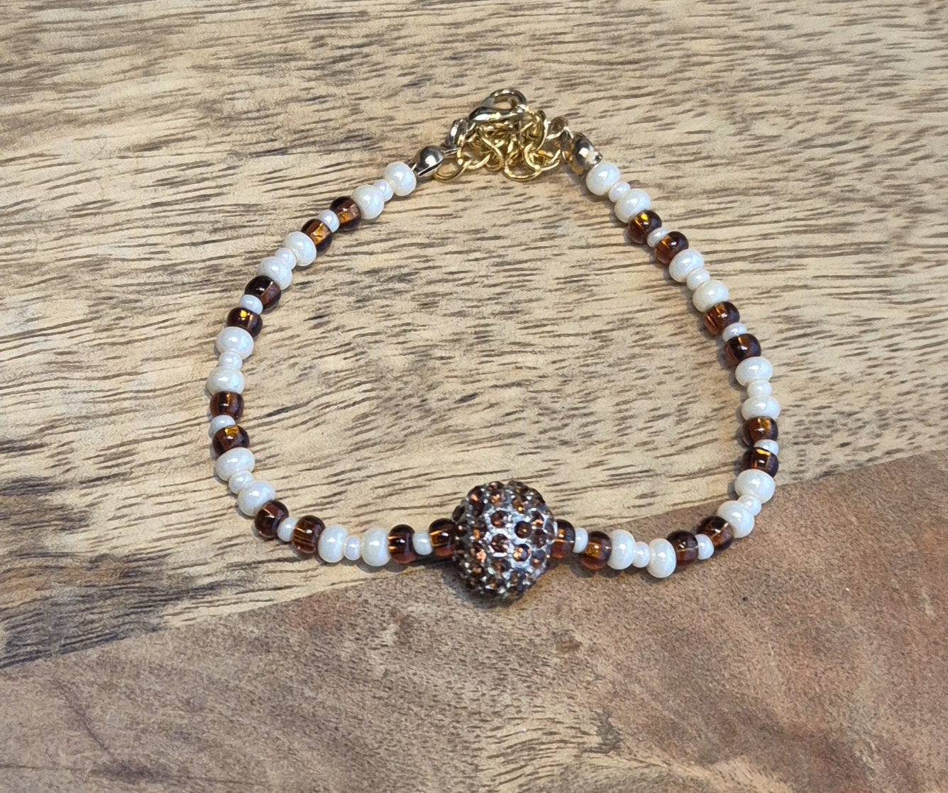 Deze prachtige bruin beige rocailles armband met strassteentjes is een absolute eyecatcher voor om je pols. De armband is voorzien van een goudkleurige sluiting met verlengketting, waardoor deze perfect past bij een polsmaat van 18cm tot 22cm. Combineer deze armband met je favoriete outfit voor een stijlvolle look die niet onopgemerkt zal blijven.