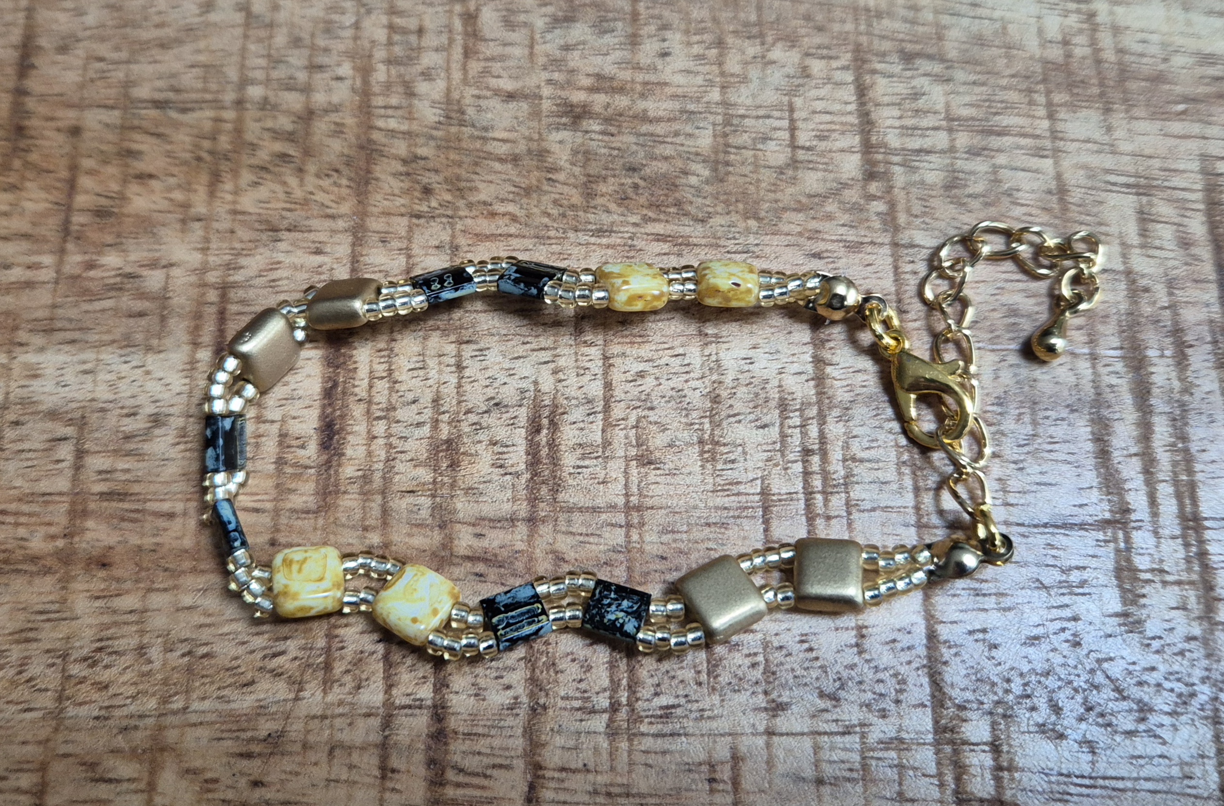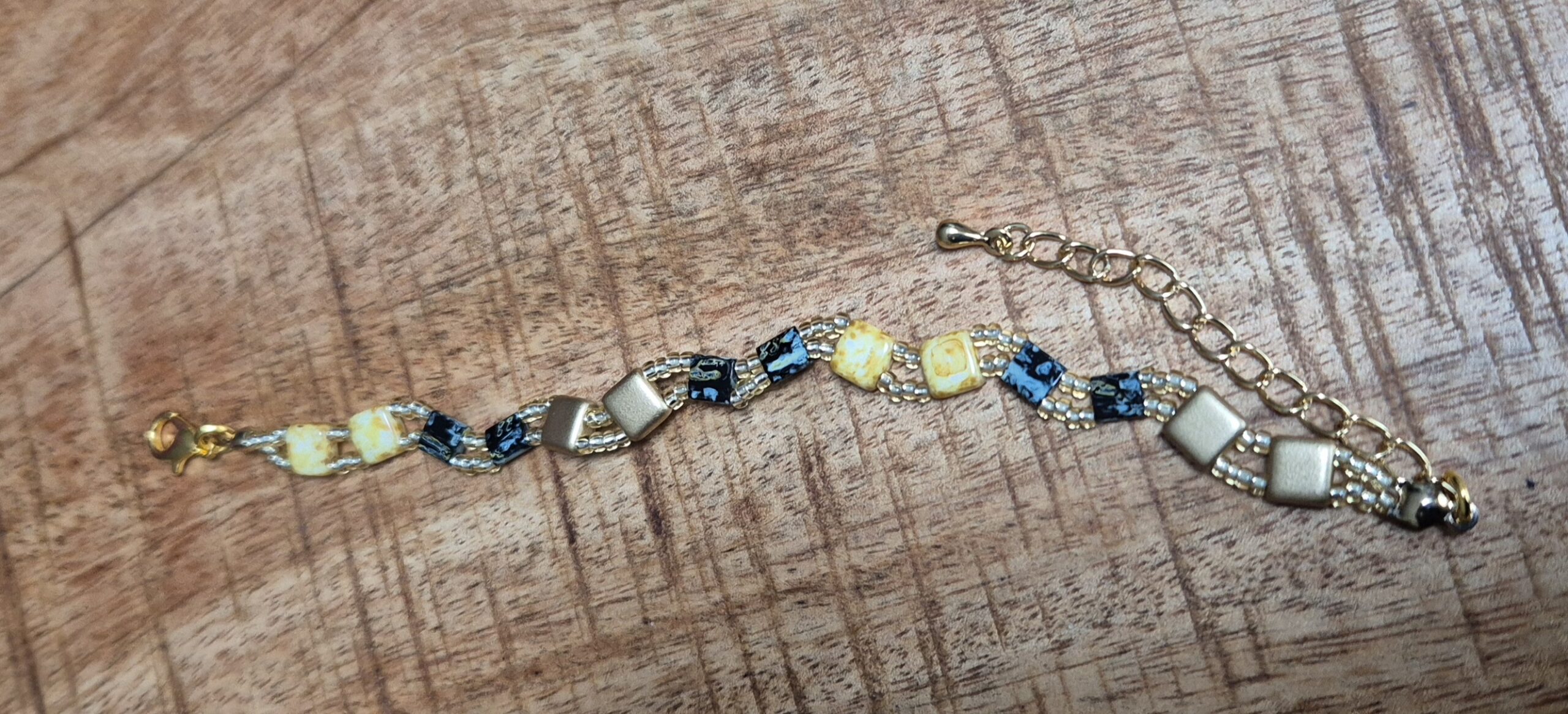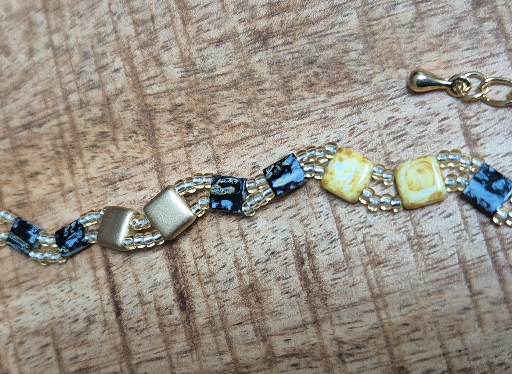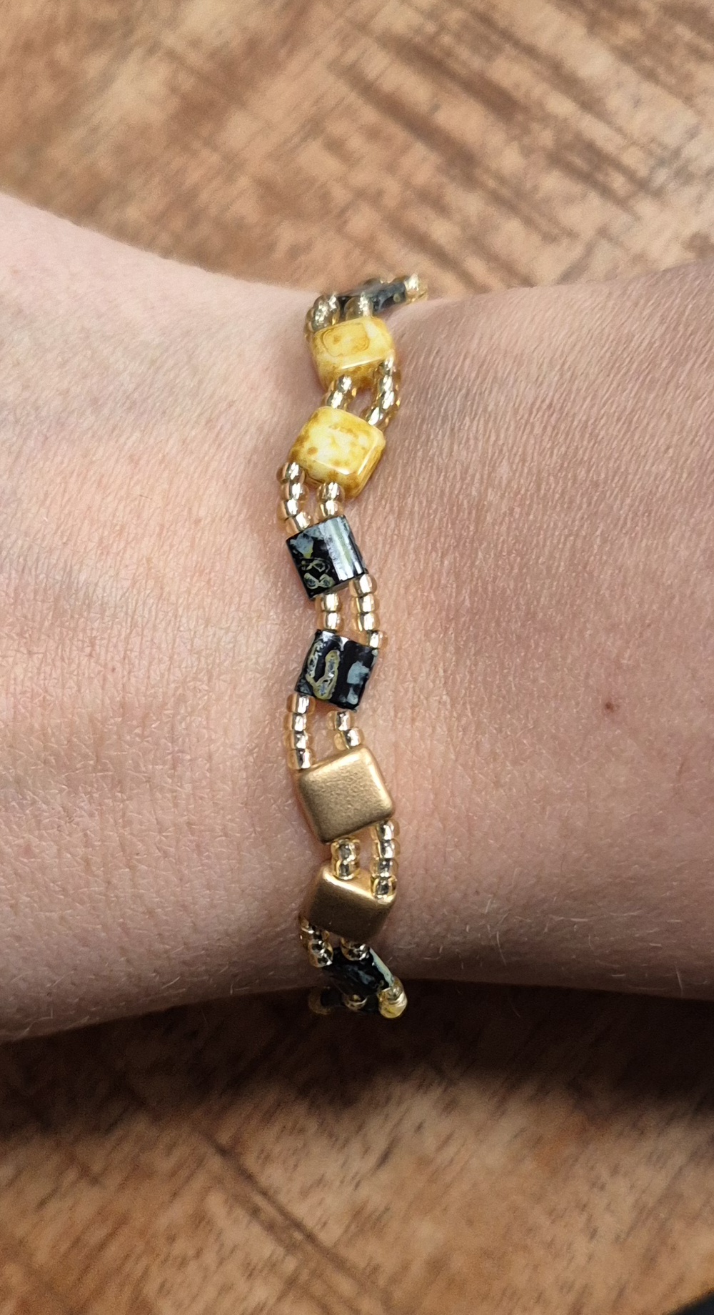 Dit elegante armbandje is gemaakt van Picasso groene, Picasso gele en bronskleurige Tila glaskralen, gecombineerd met goudkleurige 11/0 rocailles voor een verfijnde afwerking. De warme aardetinten in combinatie met het goud geven het sieraad een stijlvolle en luxe uitstraling.