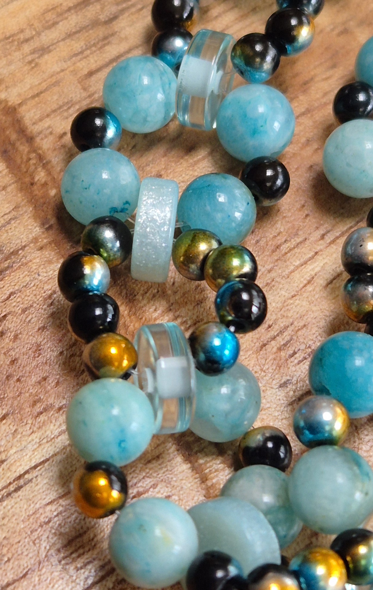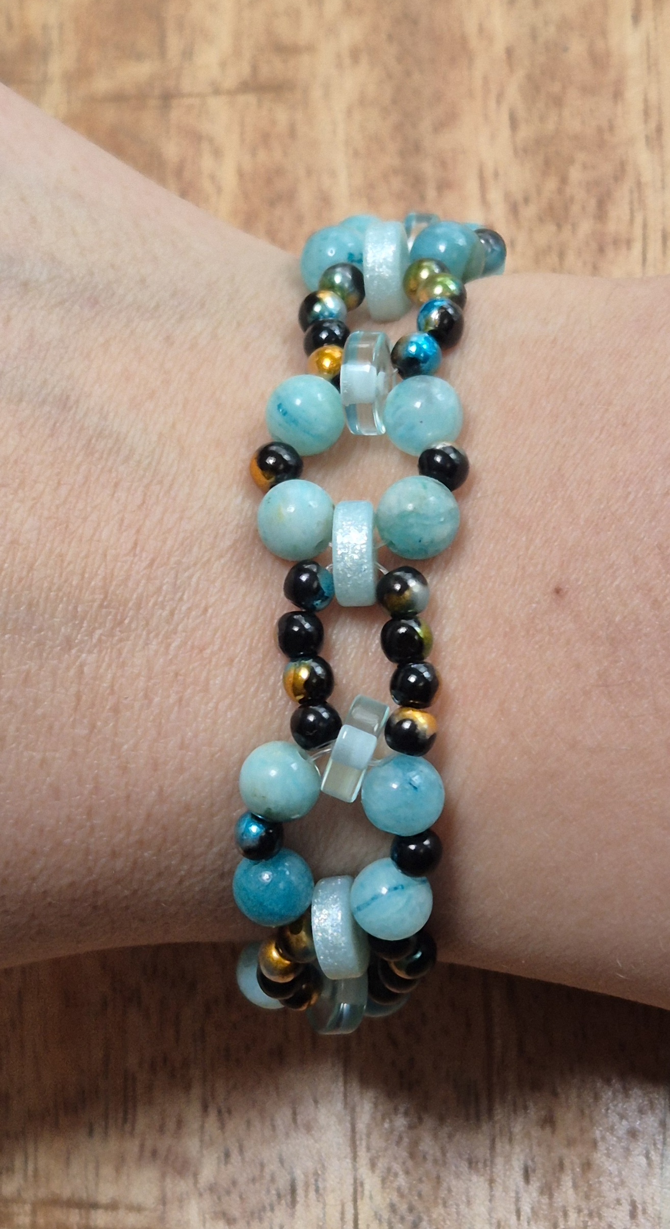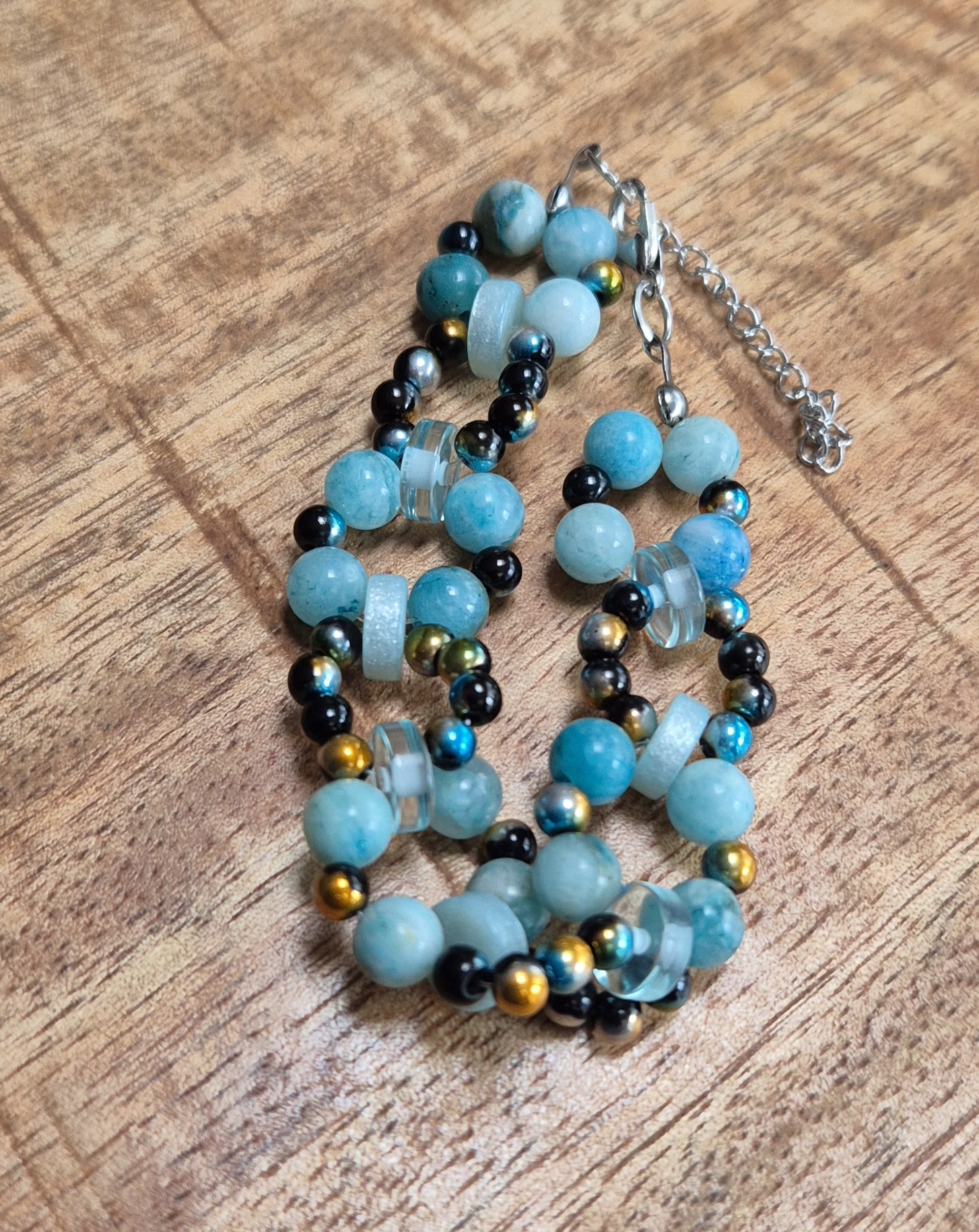 Deze prachtige armband is handgemaakt met 6mm turquoise natuursteen kralen, 4mm mix kleuren glaskralen en turquoise polaire schijfjes, waardoor elk exemplaar uniek is. De armband heeft een zilverkleurige sluiting met een verlengketting, waardoor hij geschikt is voor een polsmaat van 17cm tot 21cm.
