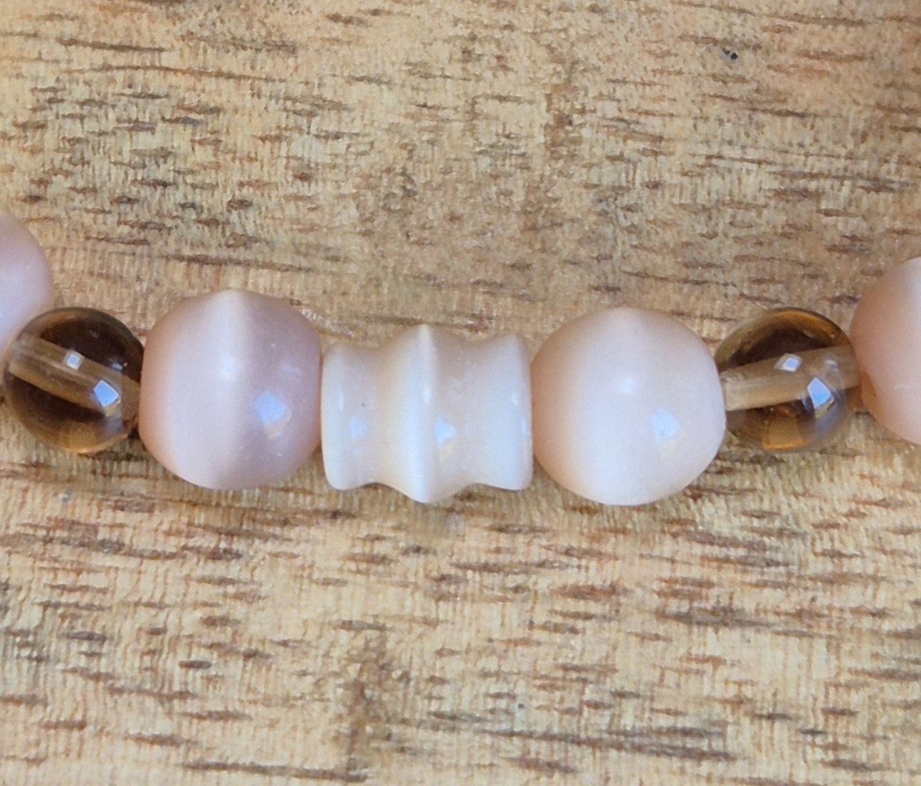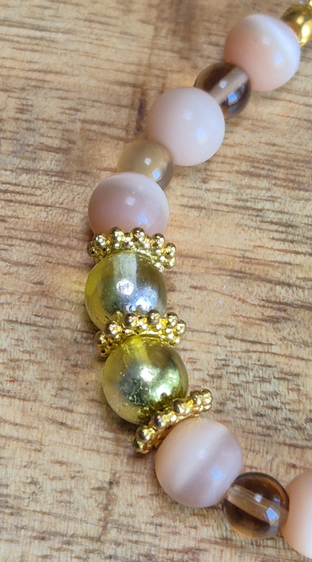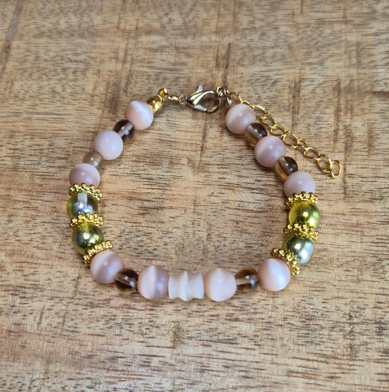 Dit stijlvolle armbandje is gemaakt van een combinatie van neutrale cateye 8 mm glaskralen, geelgroene 8 mm glaskralen, 6 mm bruine glaskralen en goudkleurige spacer kralen. De verschillende tinten en materialen zorgen voor een warme, natuurlijke uitstraling. De goudkleurige sluiting met verlengketting maakt het armbandje verstelbaar en comfortabel te dragen voor polsomtrekken van 17cm t/m 22cm.