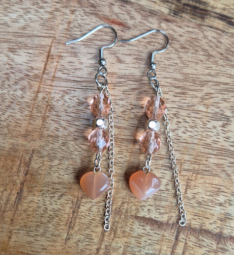 De zilverkleurige RVS oorbellen zijn voorzien van twee grote Tsjechische glazen facetten in een schitterende zalmkleur, samen met een metalen zilverkleurige kraal en een natuursteen hartje. Aan de oorbellen hangt ook een RVS ketting voor een extra vleugje stijl. Met een lengte van 7cm zijn deze oorbellen perfect voor elke gelegenheid, of je nu een dag op kantoor doorbrengt of een avondje uit gaat.