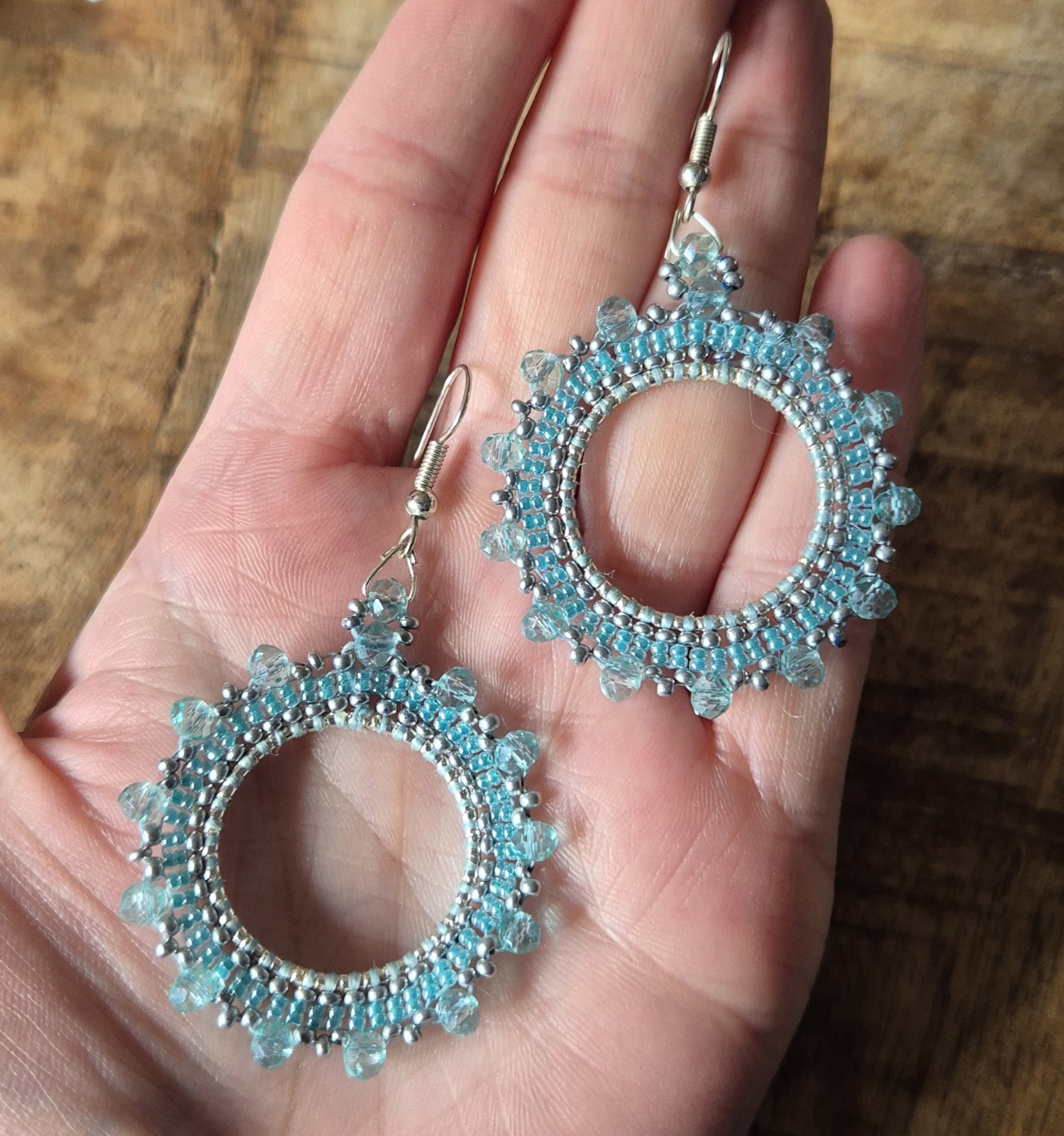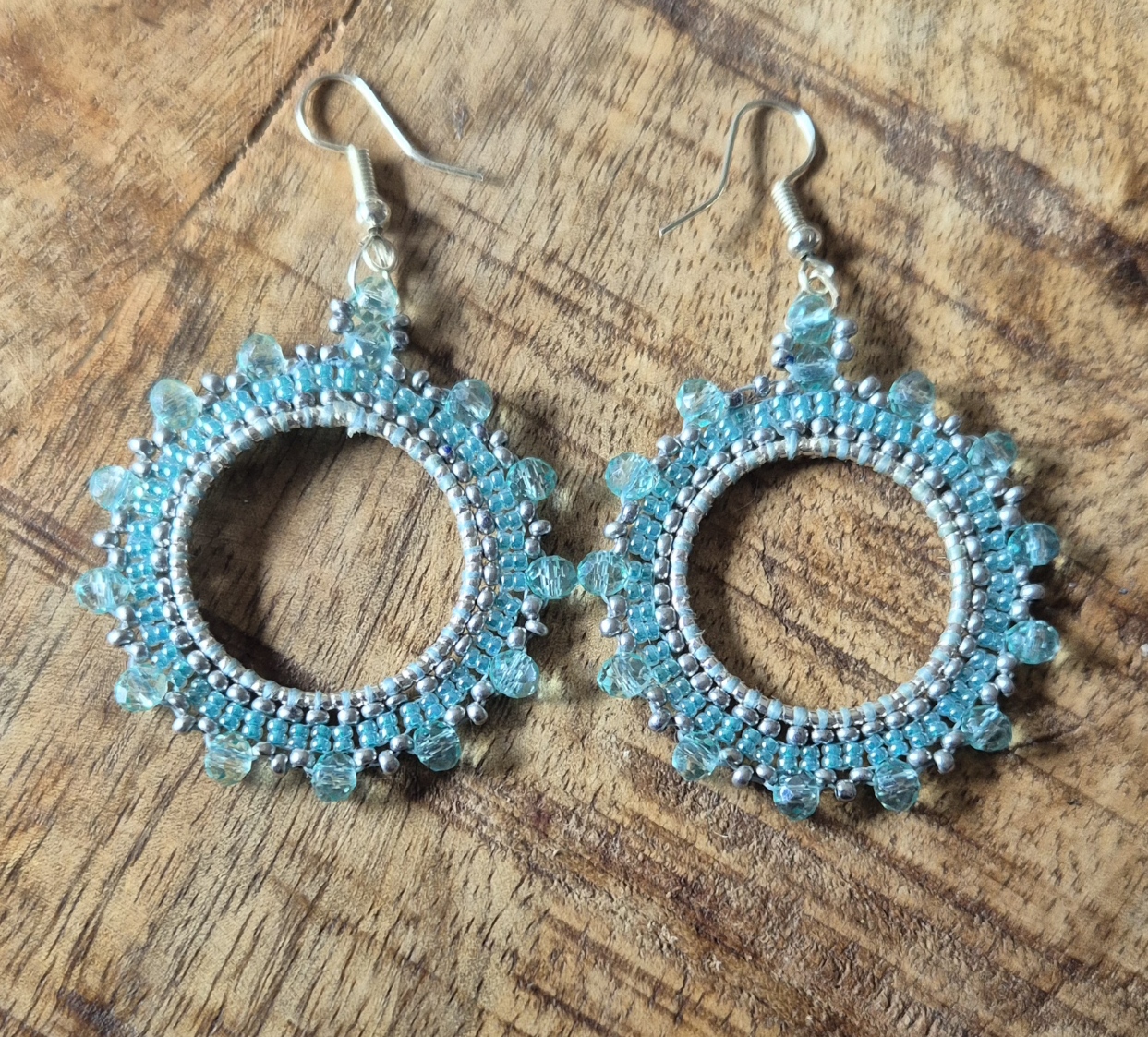 Deze handgemaakte oorbellen stralen een frisse, verfijnde elegantie uit dankzij het ronde ontwerp met een open midden en een prachtig afgewerkt randpatroon. De combinatie van zeegroene transparante kralen en zilverkleurige accenten geeft het geheel een zachte, sprankelende uitstraling die moeiteloos opvalt zonder te overheersen.