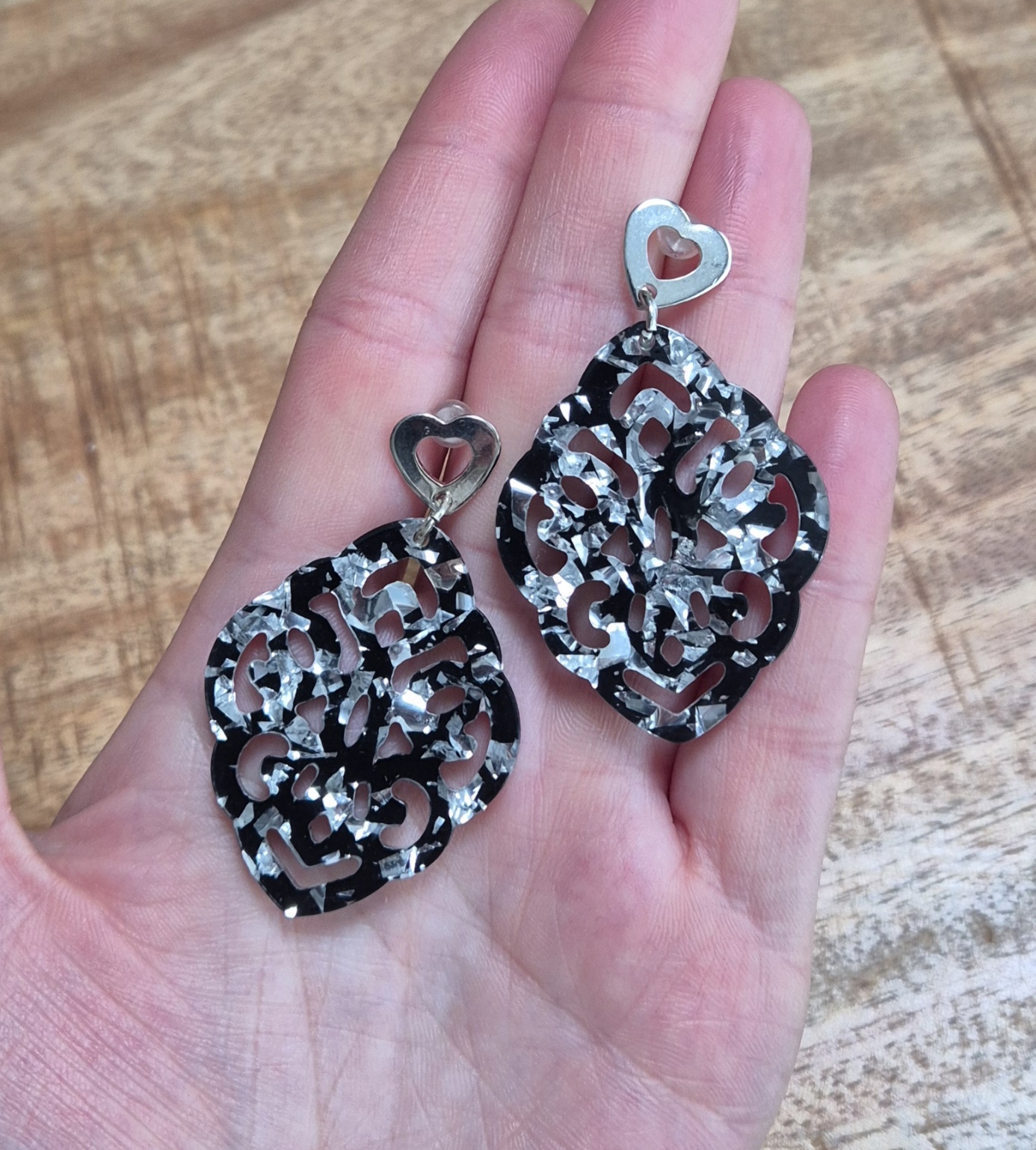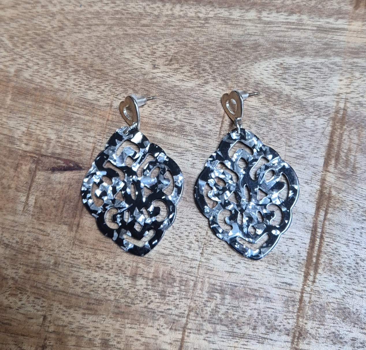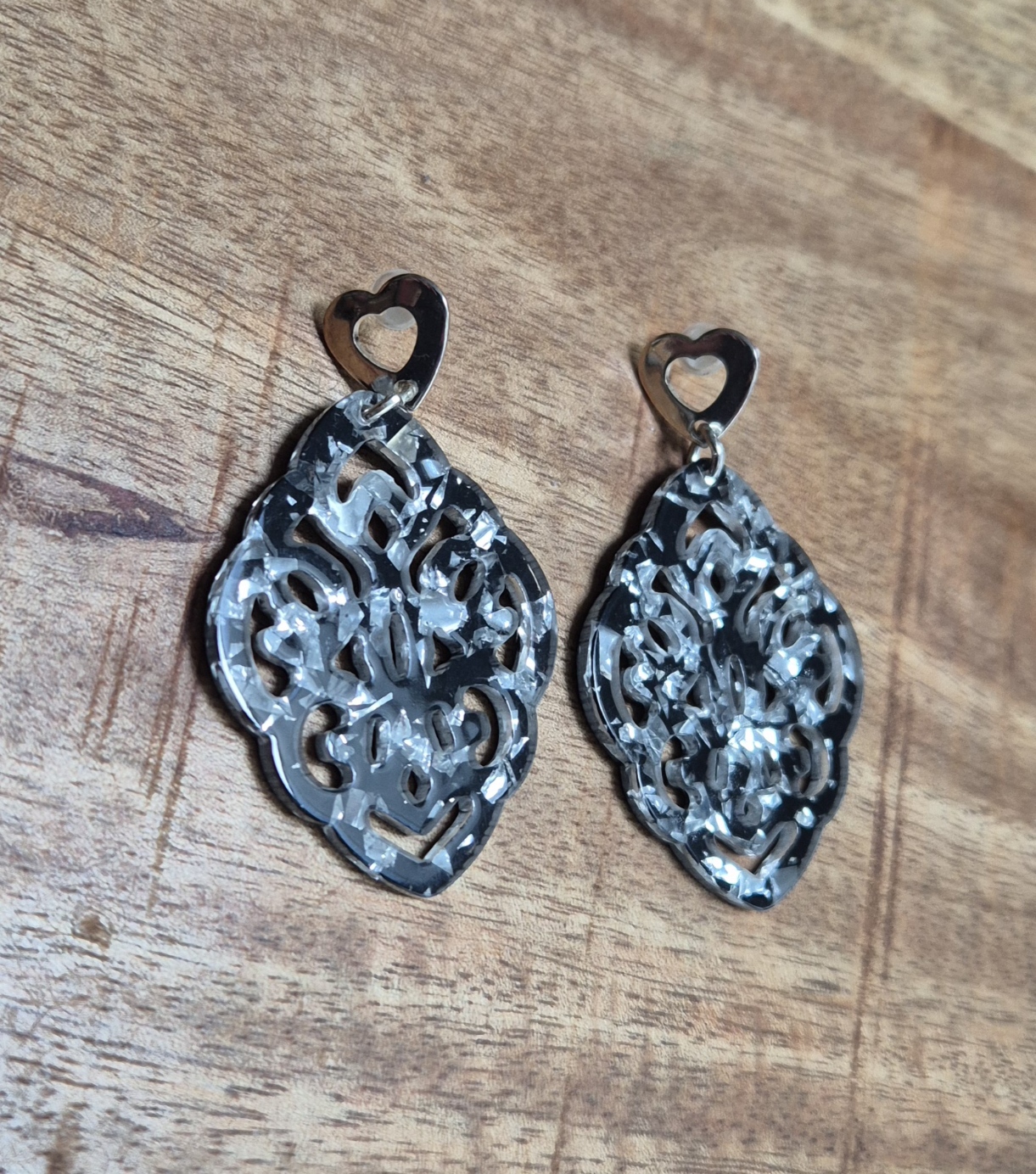 Voeg een vleugje romantische elegantie toe aan je look met deze verfijnde oorbellen. De glanzende hartvormige steker vormt een speels contrast met het sierlijk uitgesneden hangende element, dat doet denken aan een bloemachtig, filigraan patroon. Het resin vangt prachtig het licht, waardoor de oorbellen subtiel schitteren bij elke beweging.