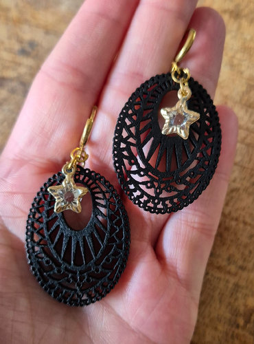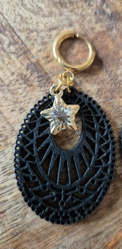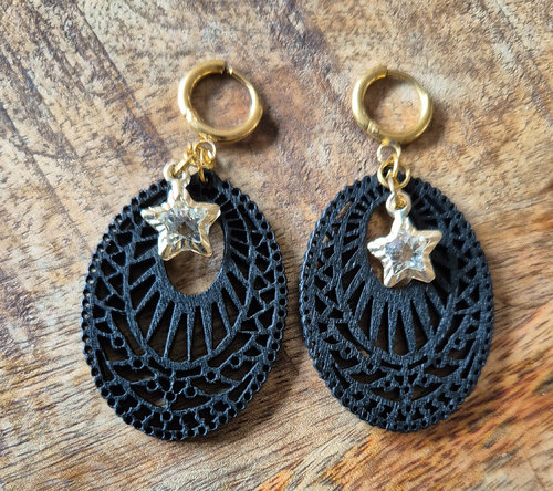 Deze oorbellen zijn voorzien van een gesneden houten bedel en een schattige gouden sterren bedel met glazen details. De hangers hangen aan goudkleurige oorringen en hebben een lengte van 5 cm.